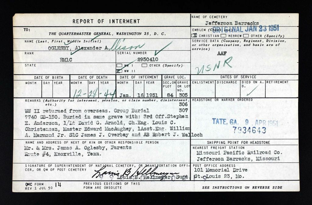 Alexander Oglesby was initially buried on Leyte Island and returned from overseas on 16 January 1951. Group Burial at Jefferson Barracks National Cemetery in Missouri (Section Section 84 Site 305-307).