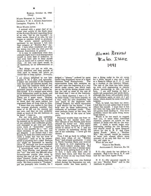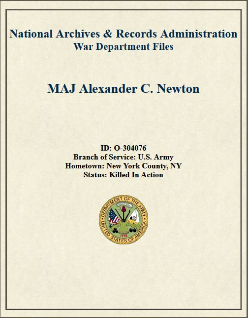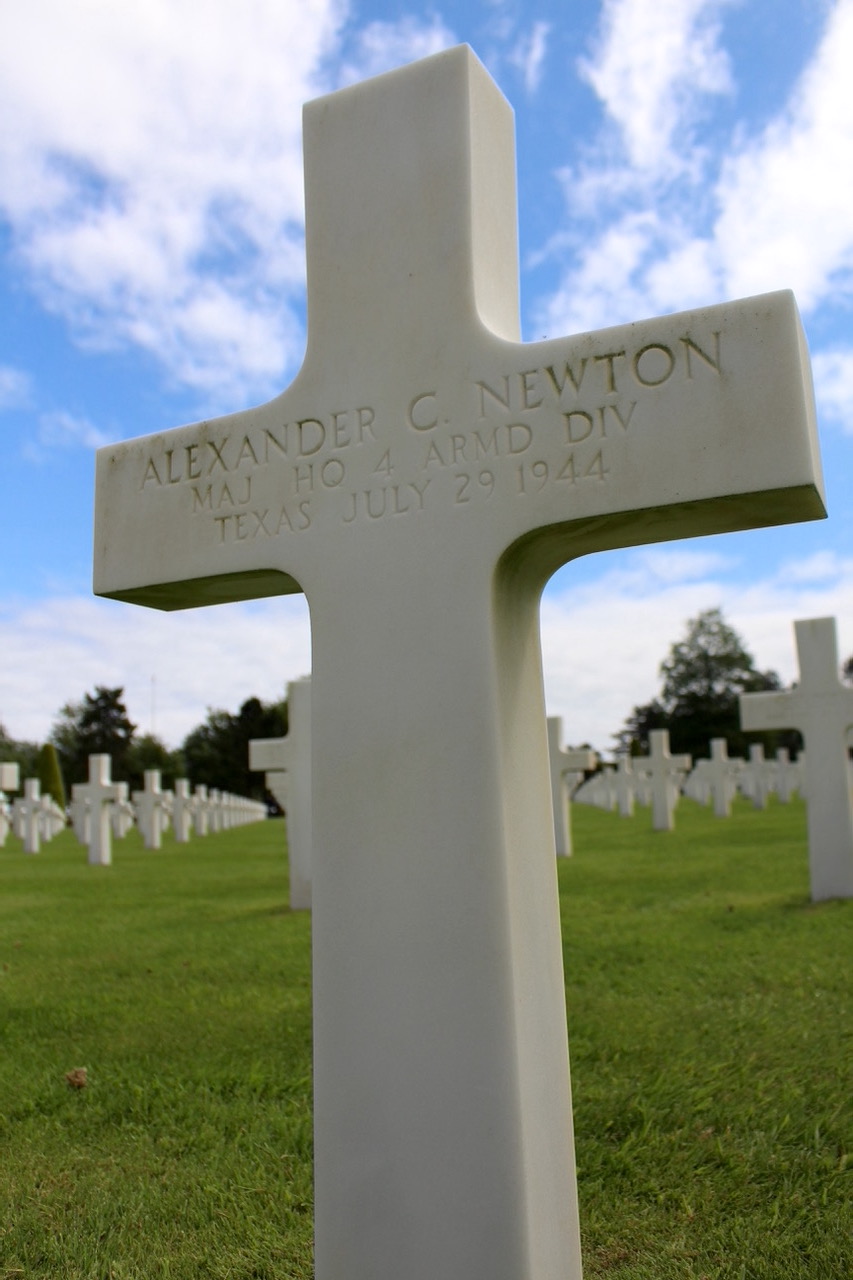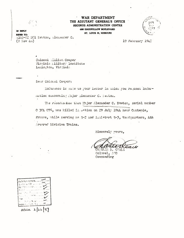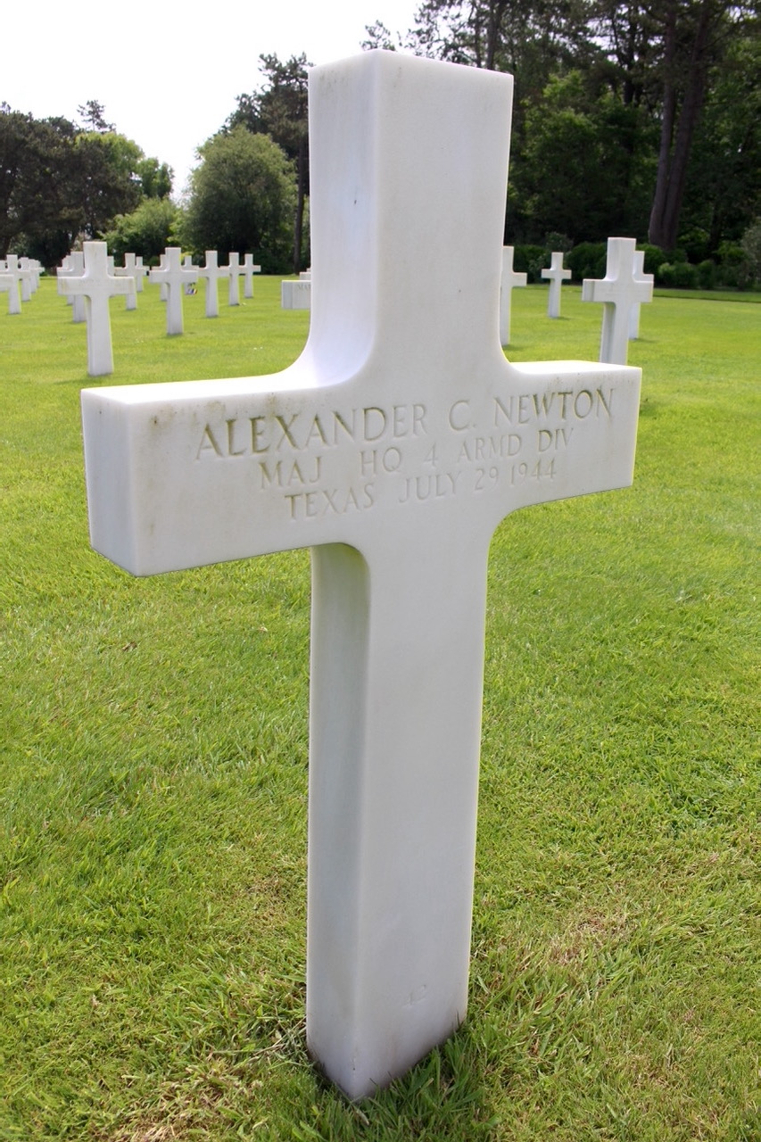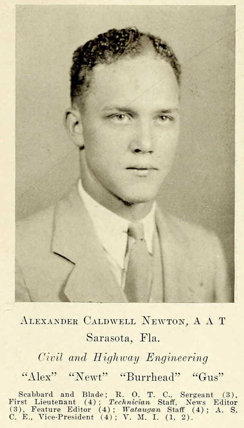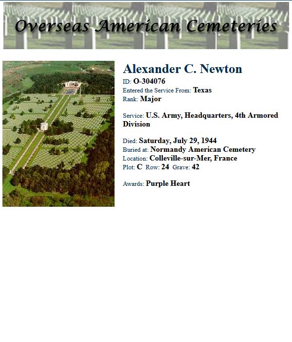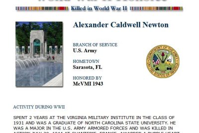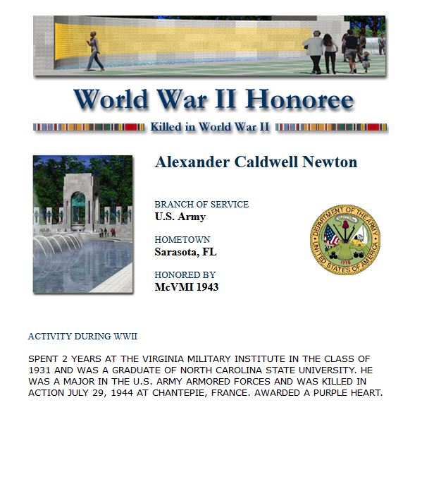 Alexander Caldwell Newton spent two years at the Virginia Military Institute in the class of 1931 and was a 1933 graduate of North Carolina State University (see photo on right). He was a Major serving with the Headquarters of the 4th Armored Division and was killed in action July 29, 1944 at Chantepie (Rennes), Brittany, France. He was awarded the Purple Heart. Major Newton is buried at the Normandy American Cemetery, Colleville-sur-Mer, France.