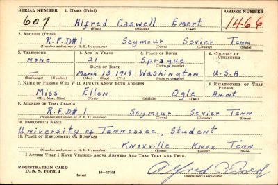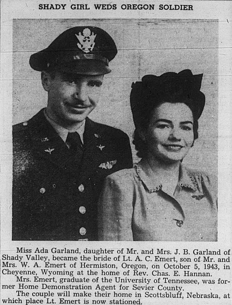 Miss Ada Garland, daughter of Mr. and Mrs. J.B. Garland of Shady Valley, became the bride of Lt. A.C. Emert, son of Mr. and Mrs. W.A. Emert of Hermiston, Oregon, on October 5, 1943, in Cheyenne, Wyoming at the home of Rev. Chas. E. Hannan. Mrs. Emert, graduate of the University of Tennessee, was forer Home Demonstration Agent of Sevier County. The couple will maken theirhome in Scottsbluff, Nebraska, at which place Lt. Emert is now stationed.