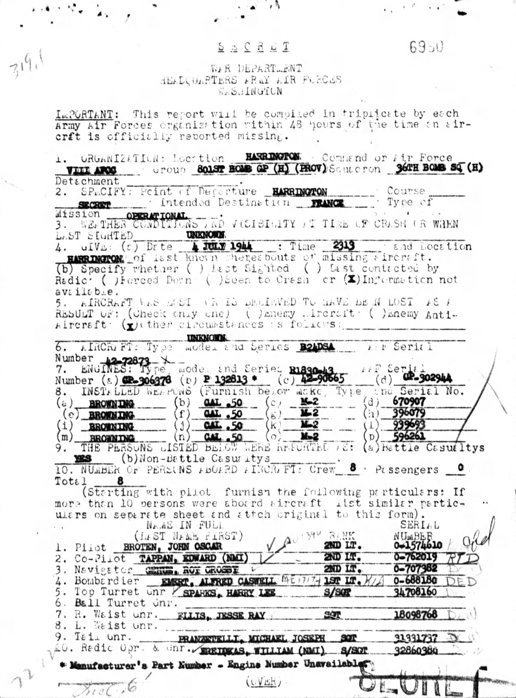 Aircraft B-24-DSA with serial number 42-72873 departed from Harrington on an operational mission to France. The crew was initially burried at Aubrais, Loiret Communal Cemetery, France.