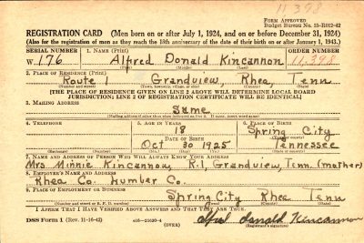 Alfred Donald Kincannon was born 30 October 1925 in Spring City, Tennessee. He was the son of Hoke Irving Kincannon and Minnie Filinger.