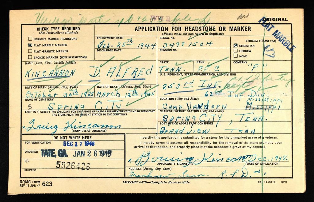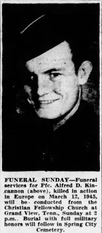 PFC Kincannon was killed in action near Bubingen, Germany on 12 March 1945.