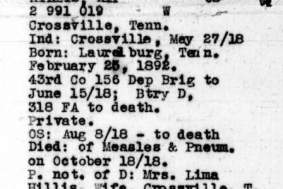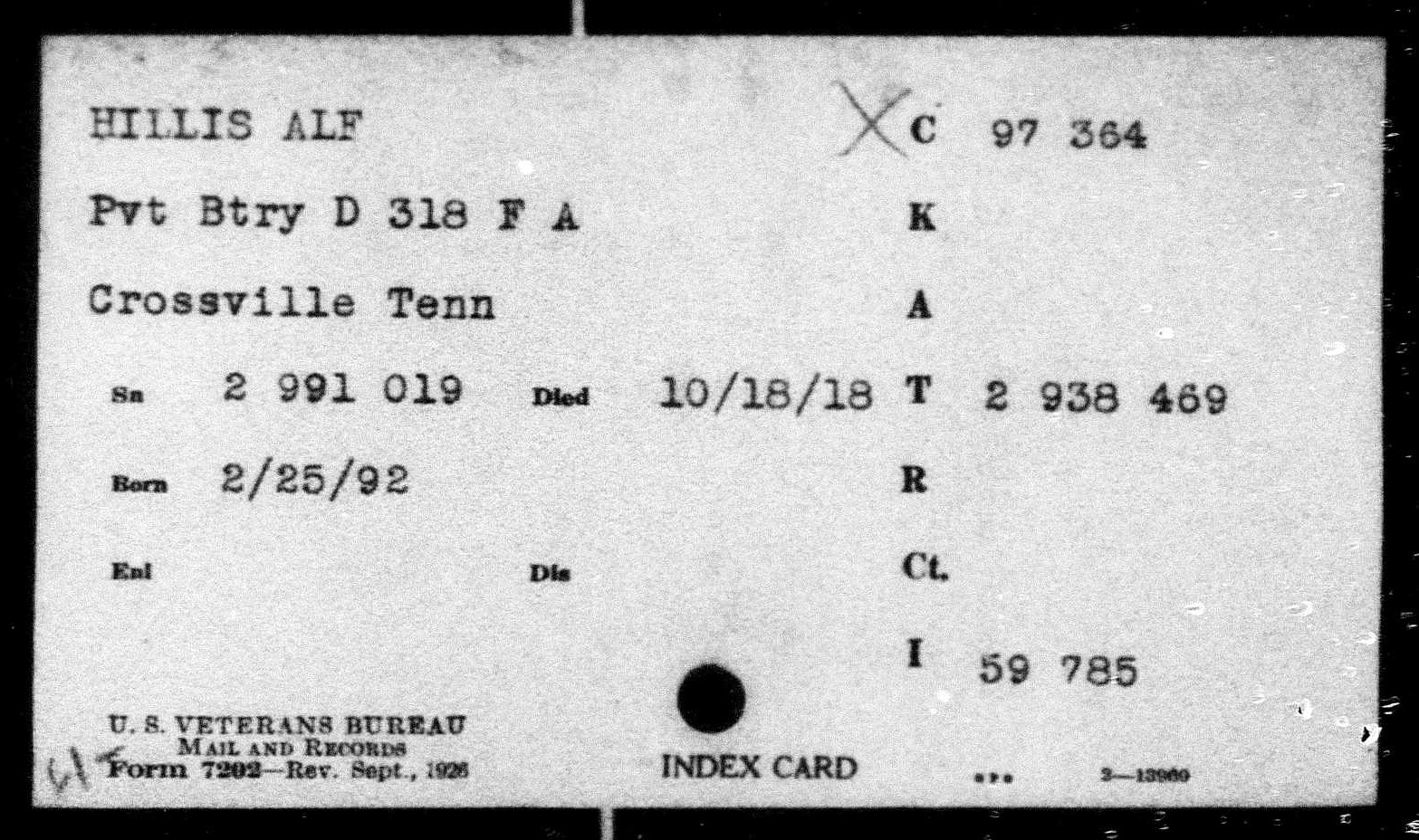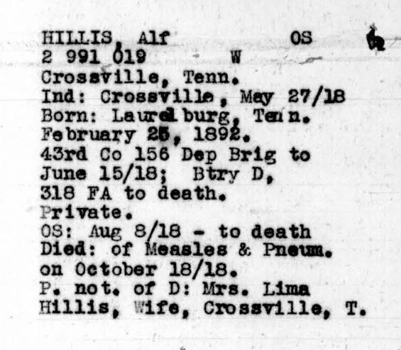 Alfred “Alf” Taylor Hillis was born in 1892 at Laurelburg, TN. He was married to Lima Hillis. He entered the service at Crossville, Tennessee on 27 May 1918. Pvt Hillis died of measles and pneumonia in Valdehon, France