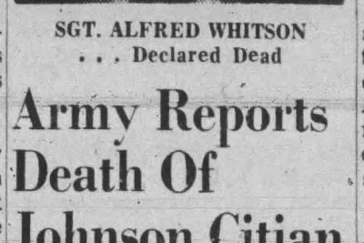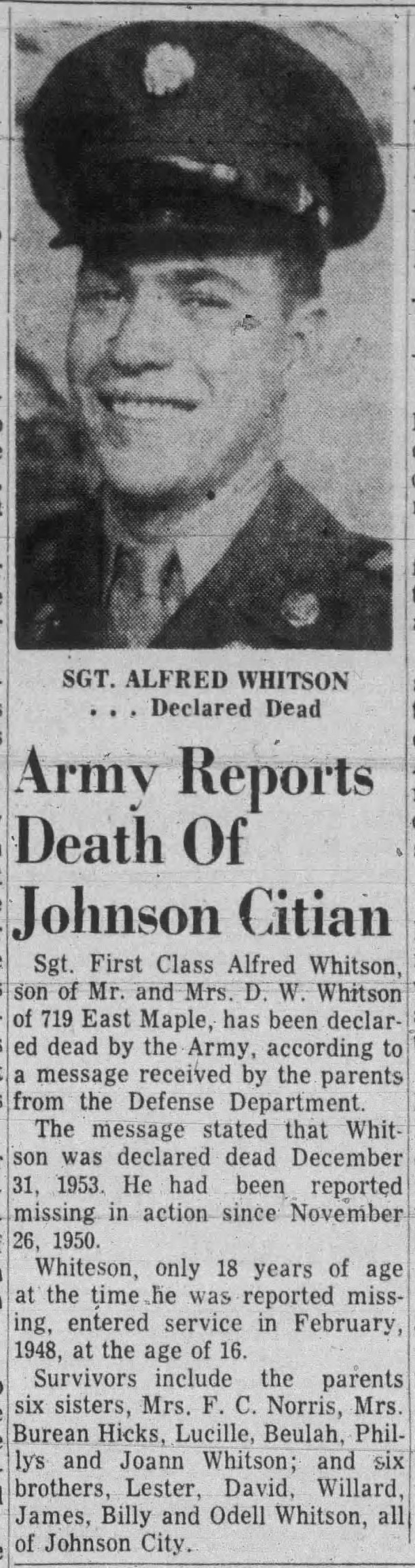 Sgt. First Class Alfred Whitson, son of Mr. and Mrs. D.W. Whitson of 719 East Maple, has been declared dead by the Army, according to a message received by the parents from the Defense Department. The message stated that Whitson was declared dead December 31, 1953. He had been reported missing in action since November 26, 1950. Whitson, only 18 years of age at the time he was reported missing, entered service in February 1948, at the age of 16.
