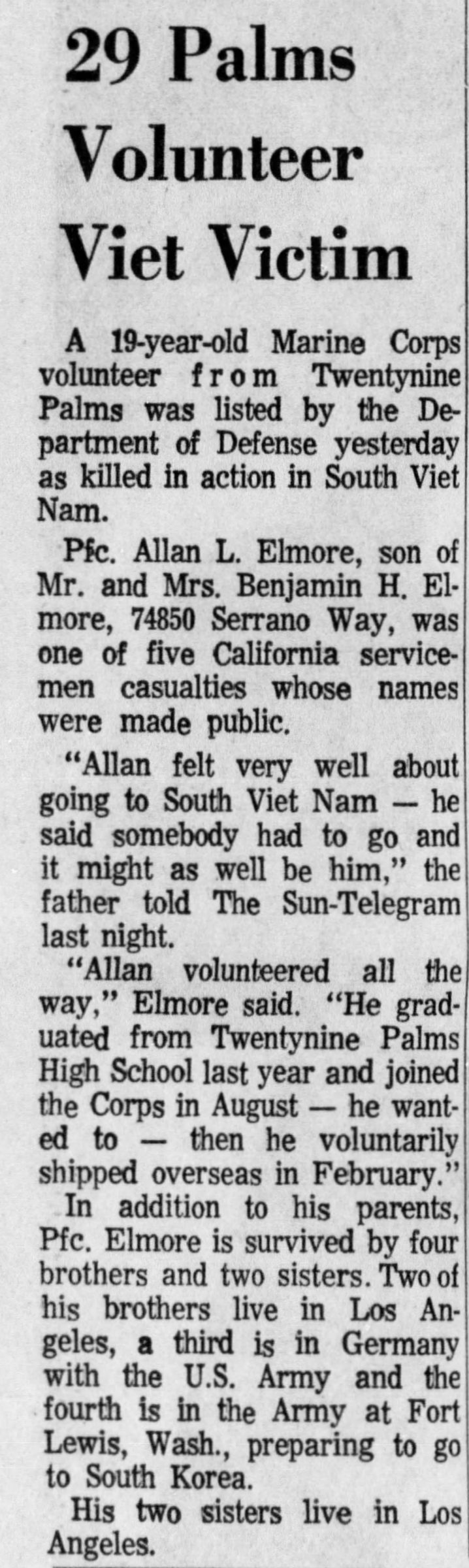 Allan, the son of Benjamin H.Elmore and Ruth Elmore, of Twenty-Nine Palms, CA, enlisted in the US Marine Corps on August 9, 1965 in Los Angeles CA. He was assigned to and serving with Company L, 3d Battalion, 7th Marines, 3d Marine Division(Rein) FMF.