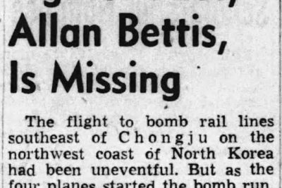 The flight to bomb rail Lines southeast of Chongju on the northwest coast of North Korea had been uneventful. But as the four planes started the bomb run, the plane piloted by Lt. Allan S. Bettis of Jefferson City crashed, apparently hit by anti-aircraft fire. The other three planes circled the area, but could see no sign of a parachute or life. “Missing in action” is the Air Force report on Lt. Bettis.