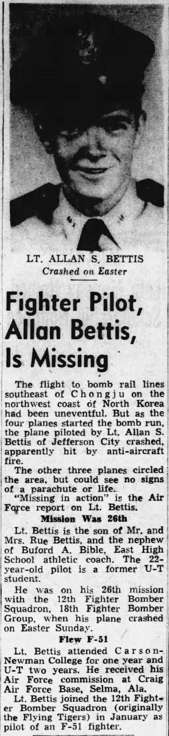 Lt. Bettis is the son of Mr. and Mrs. Rue Bettis, and the nephew of Buford A. Bible, East High School athletic coach. The 22-year-old pilot is a former U.T. student. He was on his 26th mission with the 12th Fighter Bomber Squadron, 18th FIghter Bomber Group, when his plane crashed on Easter Sunday. Lt. Bettis attended Carson-Newman College for one year and U-T for two years. He received his Air Force commission at Craig Air Force Base, Selma, Ala. Lt. Bettis joined the 12th Fighter Bomber Squadron (originally the Flying Tigers) in January as pilot of an F-51 fighter.