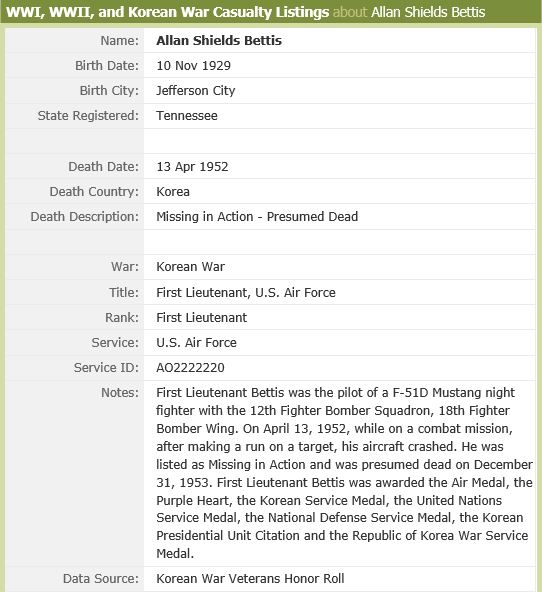 First Lieutenant Allan Shields Bettis was the pilot of a F-51D Mustang night fighter with the 12th Fighter Bomber Squadron, 18th Fighter Bomber Group. On April 13, 1952, while on a combat mission, after making a run on a target, his aircraft crashed. He is listed as Missing in Action and was presumed dead on December 31, 1953. The following is an account from the pages of the 18th Fighter Bomber Wing Roll of Honor.