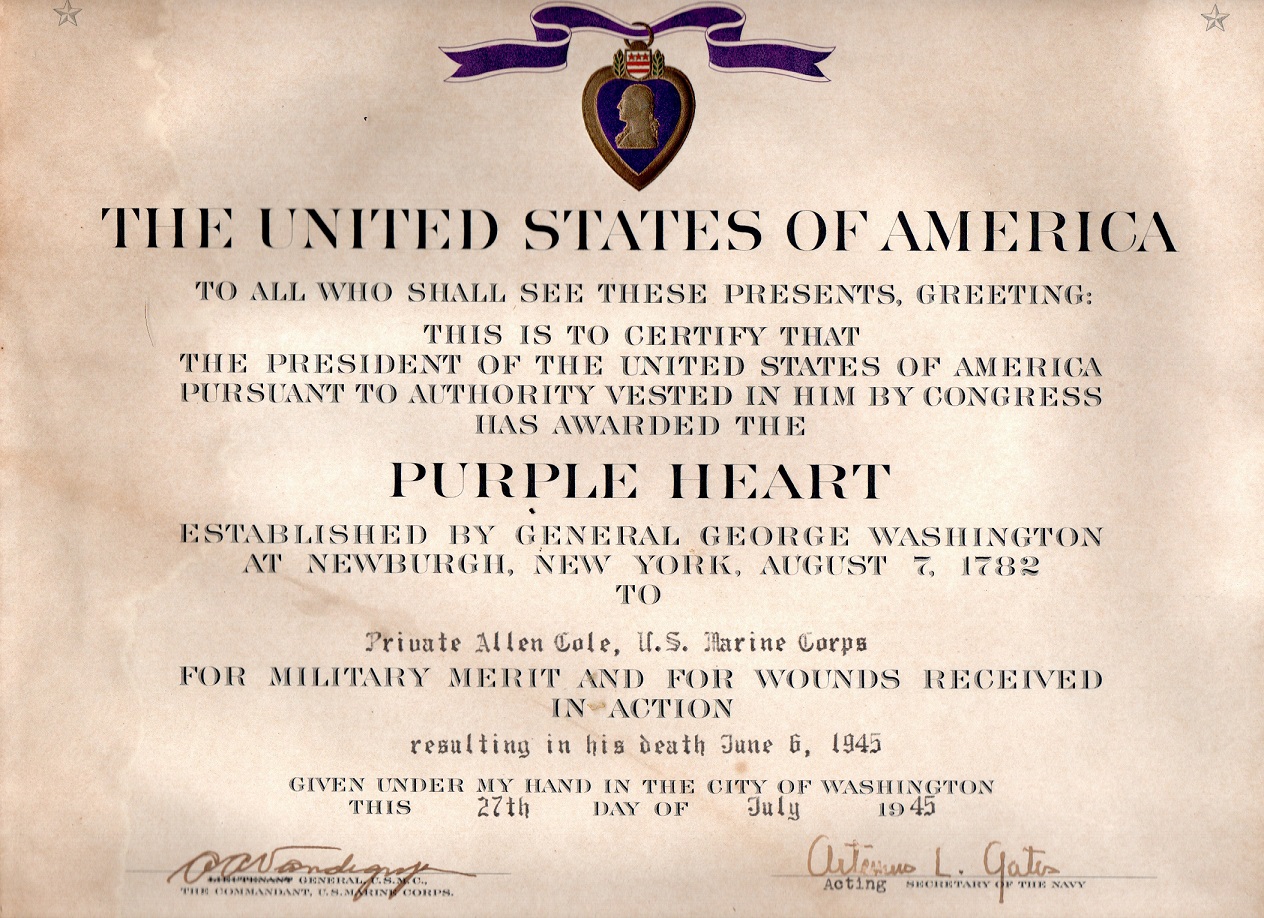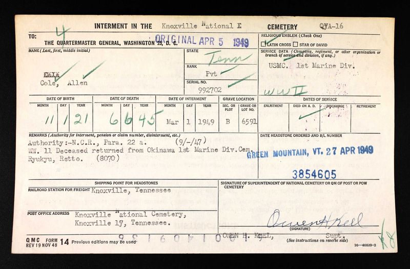 Pvt Cole was initially buried at Okinawa, 1st Marine Division Cemetery, Ruykuy, Retto. Reinterred at Knoxville National Cemetery, Knoxville, TN, B, 6591