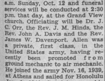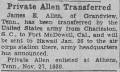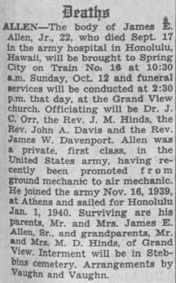 The body of James E. Allen, Jr., 22 who died Sept. 17 in the army hospital in Honolulu, Hawaii, will be brought to Spring City on Train no. 16 at 10:30 a.m. Sunday, Oct. 12 and funeral services will be conducted at 2:30 p.m. that day, at the Grand View church. Officiating will be Dr. J.C. Orr., the Rev. J.M. Hinds, the Rev. John A. Davis and the Rev. James w. Davenport. Allen was a private first class in the United States army, having recently been promoted from ground mechanics to air mechanics. He joined the army Nov. 16, 1939 at Athens and sailed for Honolulu Jan. 1, 1940. Surviving are his parents, Mr. and Mrs. James E. Allen, Sr., and grandparents, Mr. and Mrs. M.D. Hinds, of Grand View. Interment will be in Stebbins cemetery.