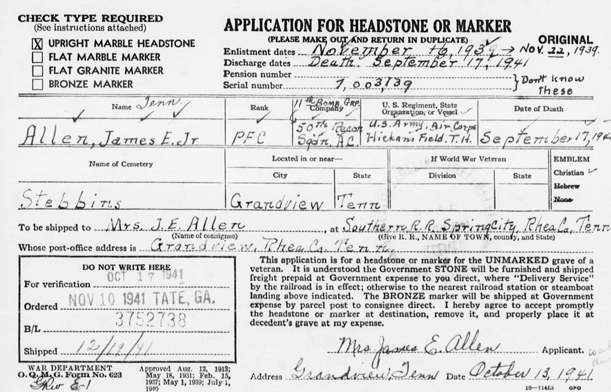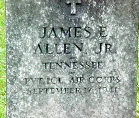 PFC James Edward Allen Jr. was the son of James Edward Allen and Esther Hinds. He served with the 50th Reconnaissance Squadron, 11th Bomber Squadron. He was based at Hickam Field, Hawaii. During his stay in Hawaii he had been attending the University of Hawaii. He died on 17 September 1941 following an appendectormy in Tripler General Hospital. He is buried at Stebbins Cemetery at Grandview, Rhea County, TN.