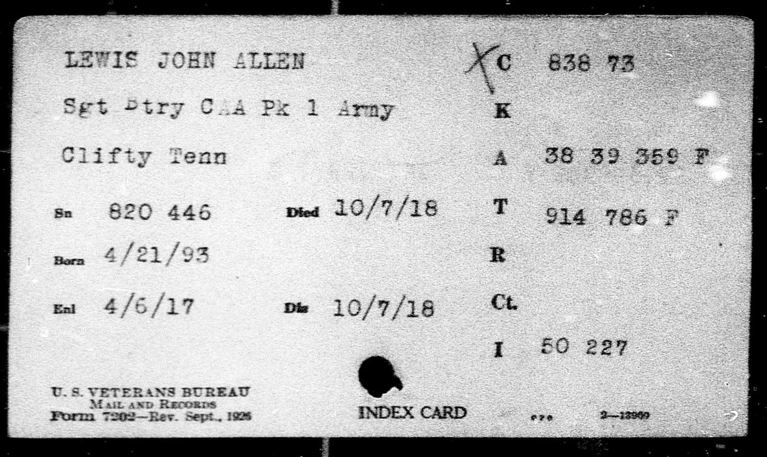 John Allen Lewis enlisted on April 6, 1917. He died on 7 October 1918 in France.