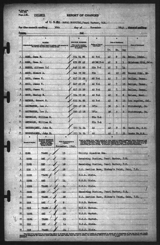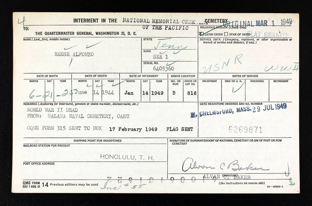 Alphonzo Reese was a patient of the U.S. Naval Hospital at Pearl Harbor on 18 November 1942. He was initially buried at Halawa Naval Cemetery, Oahu.