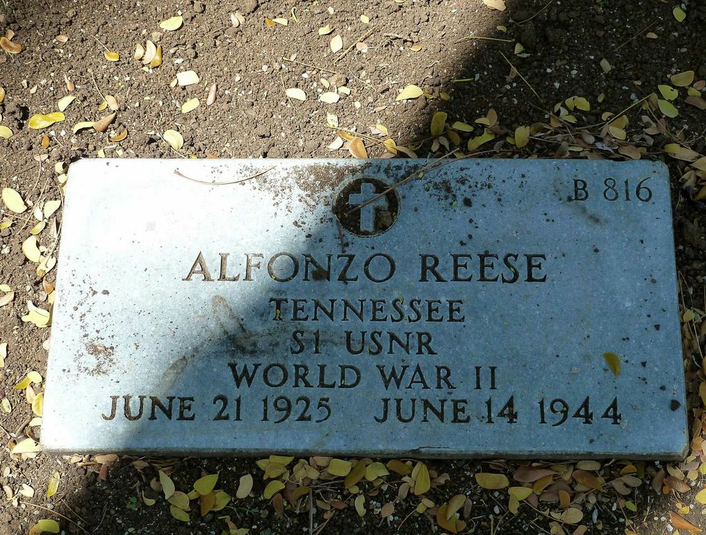 Alphonzo Reese served as a Seaman First Class in the Navy. He died 14 June 1944 and is buried in the National Memorial Cemetery of the Pacific, Honolulu, Hawaii. Plot B Row 0 Grave 816.