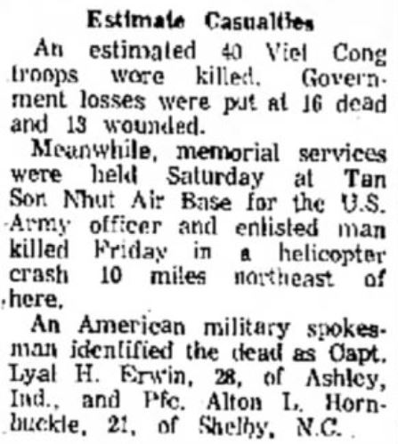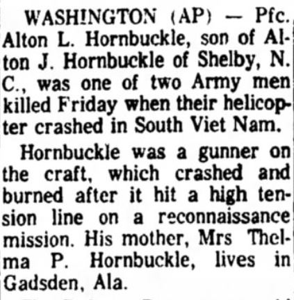 Alton Lee Hornbuckle was a door gunner in a Huey helicopter that hit a power line on low recon while on convoy support. His death was listed as non-hostile. He attended Lee College at Cleveland, Tennessee.