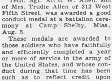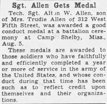 T/Sgt. Alton W. Allen, son of Mr. and Mrs. John Allen, 312 West Fifth Street previously reported missing in action since July 22, now has been reported killed in action on that date. Sgt. Allen was the husband of Mrs. Kathleen Allen of Blackshear, Fla. He had been in the army for eight years. He was stationed in the Panama Canal Zone for three years and had been in England five months before going into France July 1.