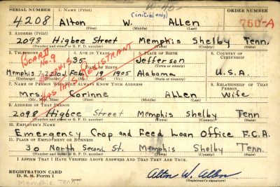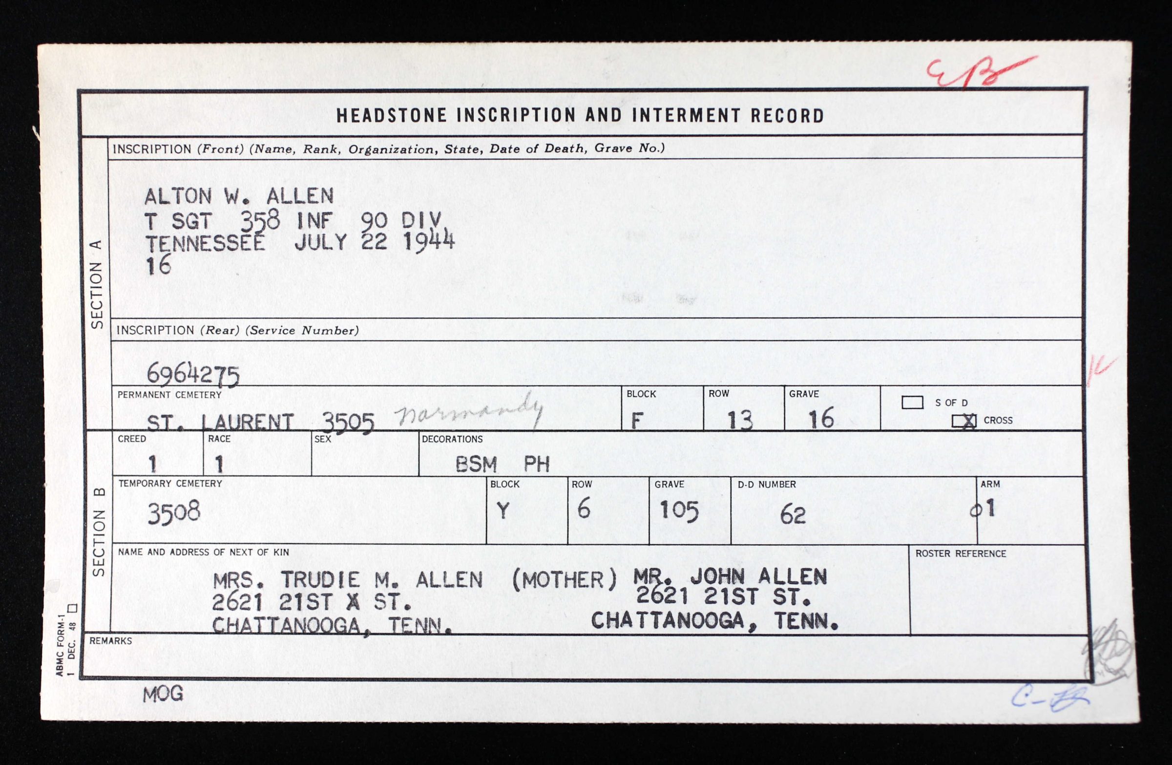 Technical Sergeant Alton W. Allen was assigned to the 358th Infantry Regiment, 90th Infantry Division which was engaged in the battle for Normandy at the time of his death on 22 July 1944. He is interred at R,13,16 Normandy American Cemetery, Colleville-sur-Mer, France.