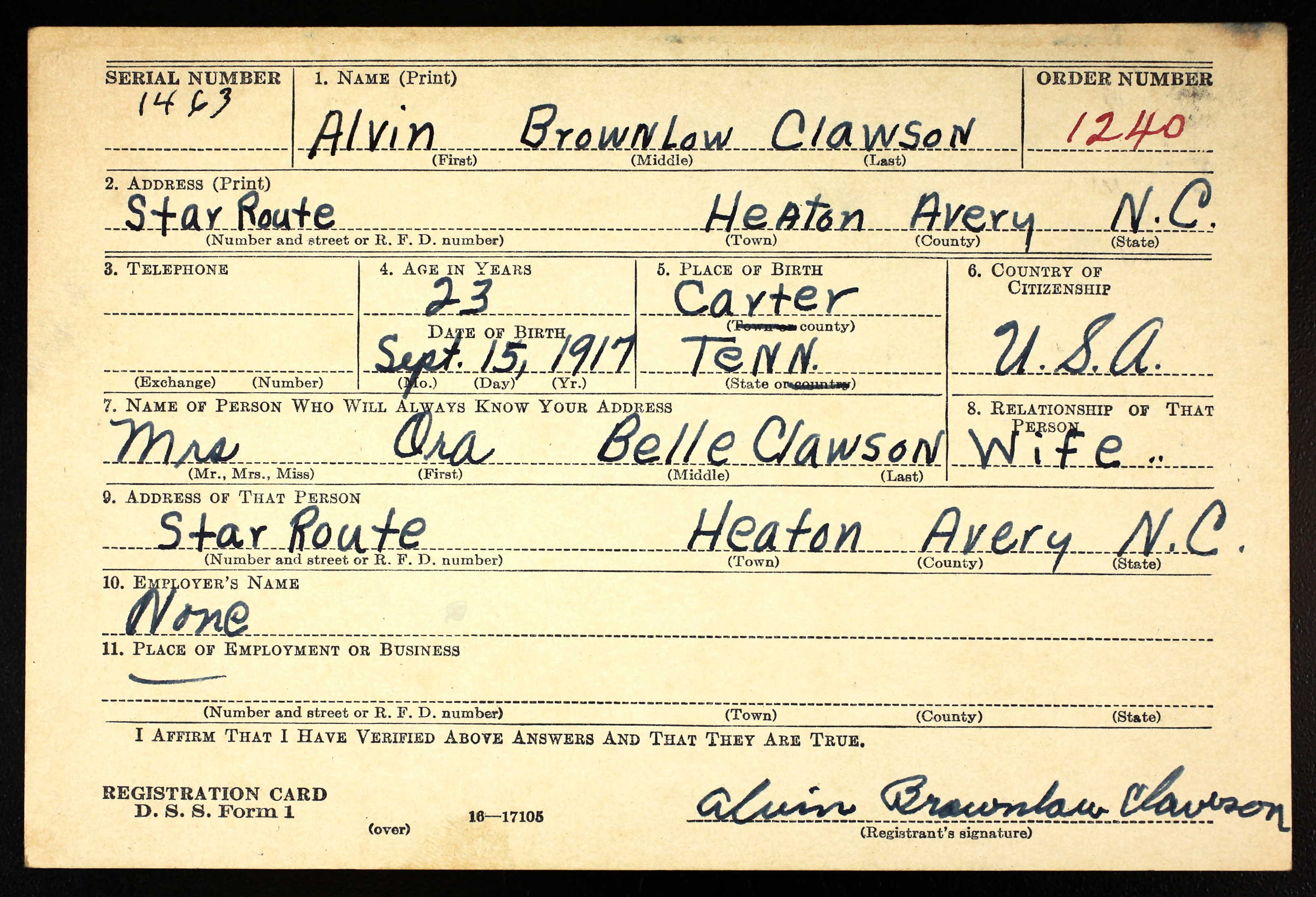 Alvin Brownlow Clawson was the son of John Lafayette (Fate) Clawson and Sarah Elizabeth Hollifield. Husband of Ora Belle Guy. Father of Shirley Louise Clawson.