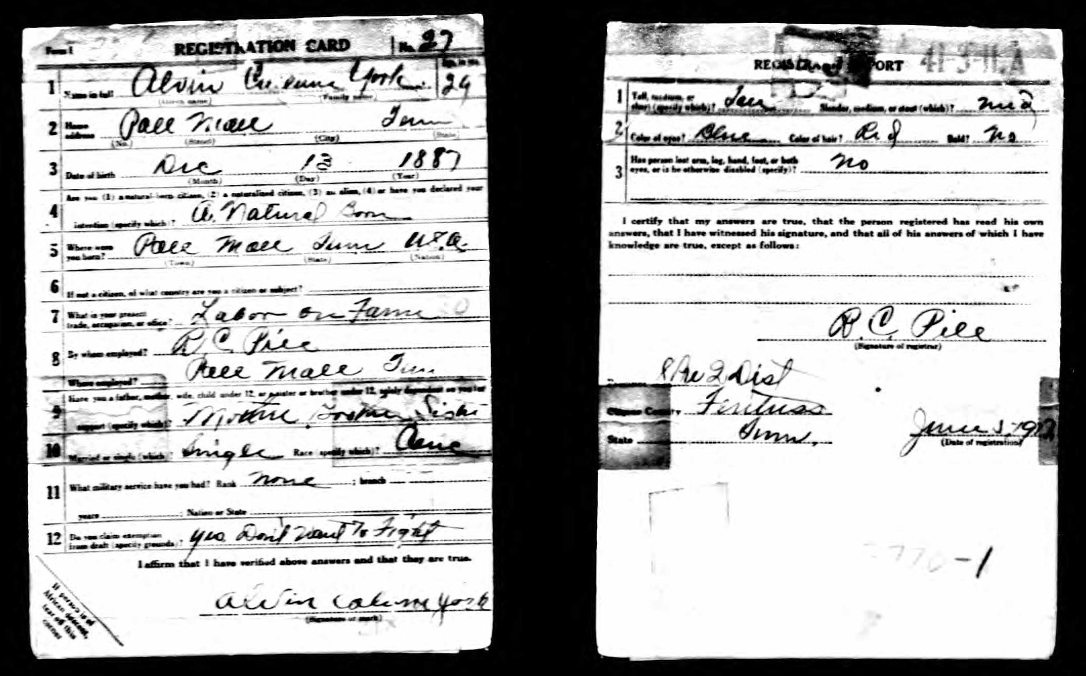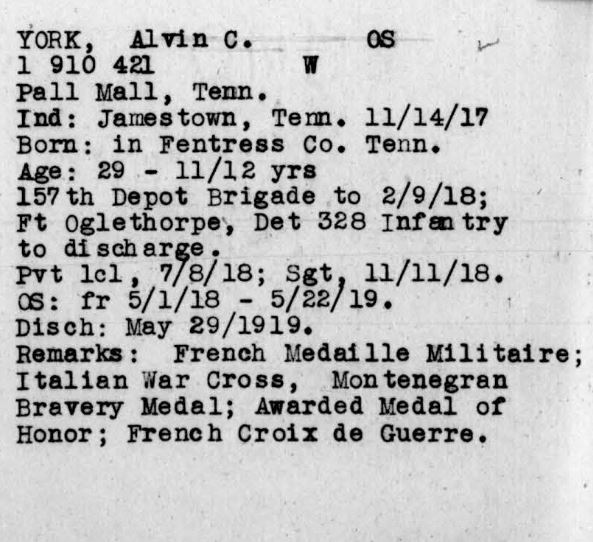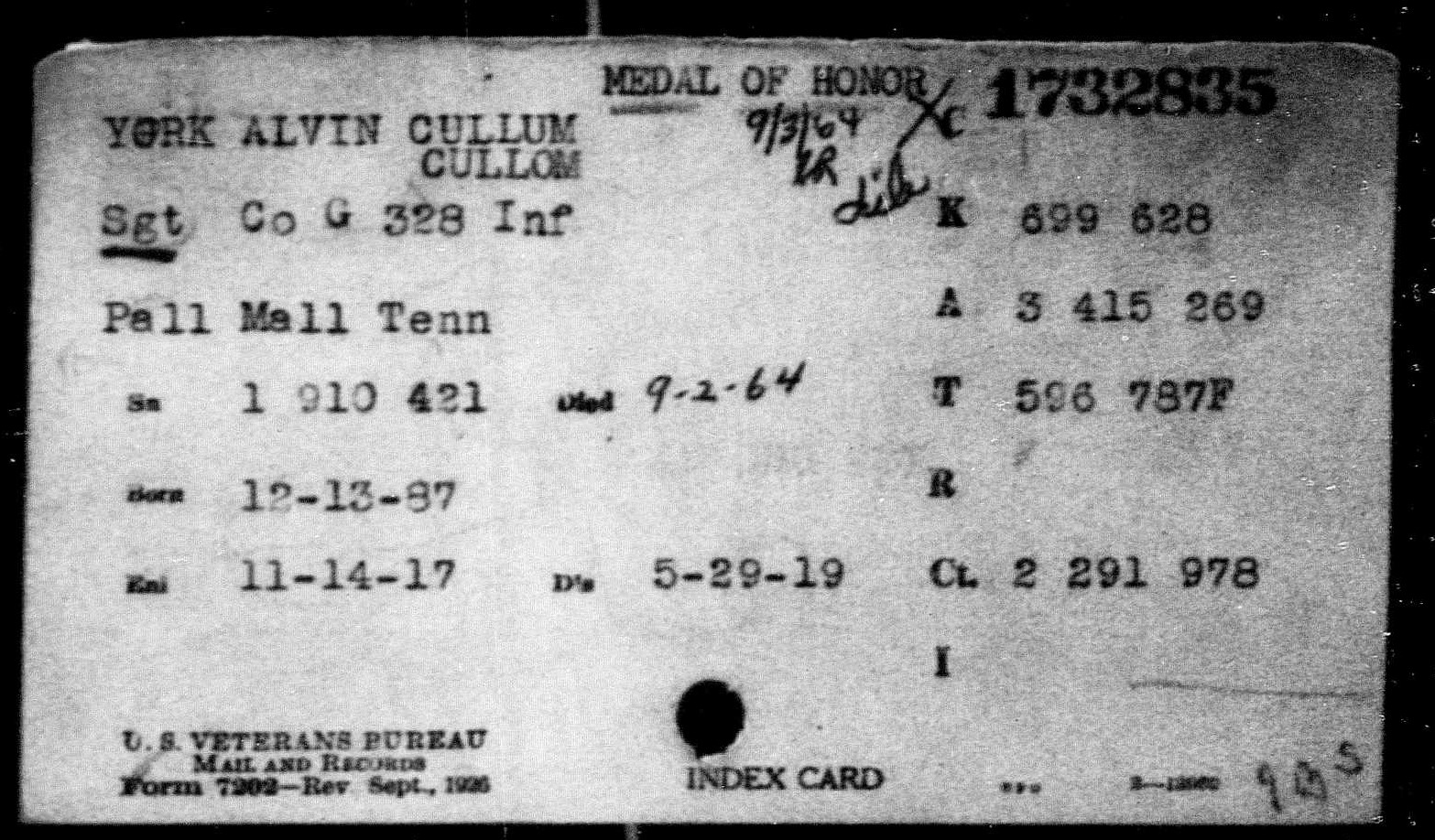 Alvin Calvin York was born on 13 December 1887 at Pall Mall, Fentress County, TN. Son of William Uriah York and Mary Elizabeth Brooks. Husband of Grace Williams. He died 2 September 1964 in Nashville, TN