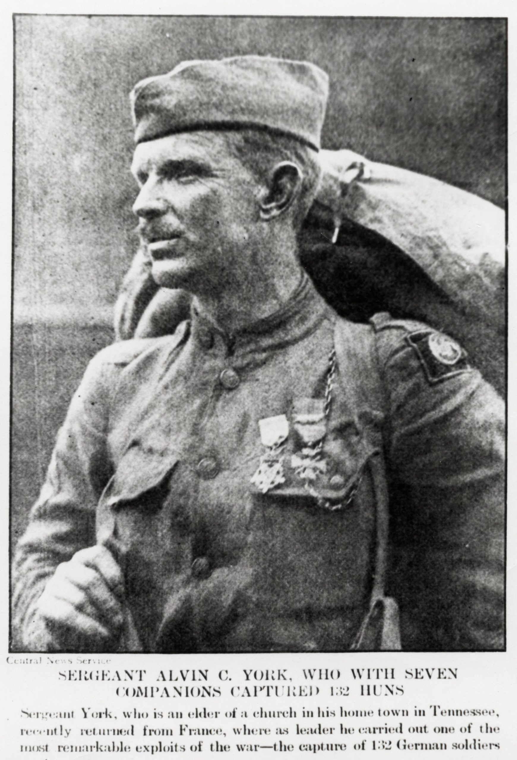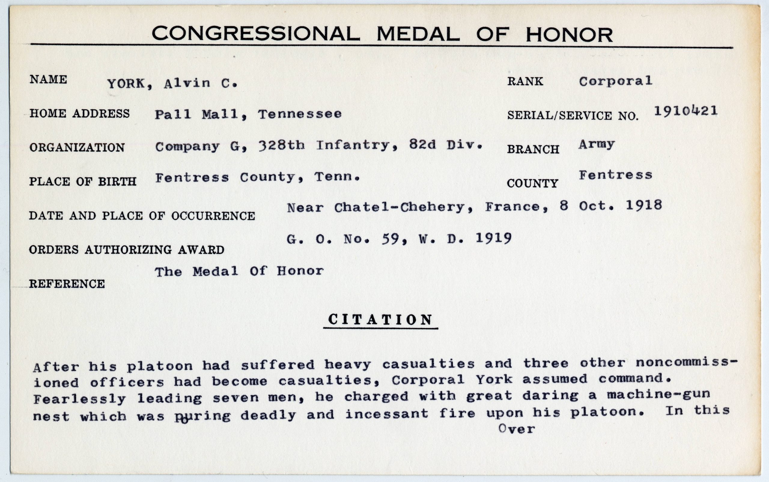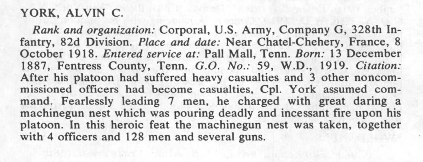 After his platoon had suffered heavy casualties and 3 other noncommissioned officers had become casualties, Cpl. York assumed command. Fearlessly leading 7 men, he charged with great daring a machinegun nest which was pouring deadly and incessant fire upon his platoon. In this heroic feat the machinegun nest was taken, together with 4 officers and 128 men and several guns.”