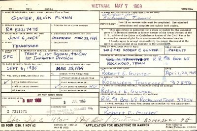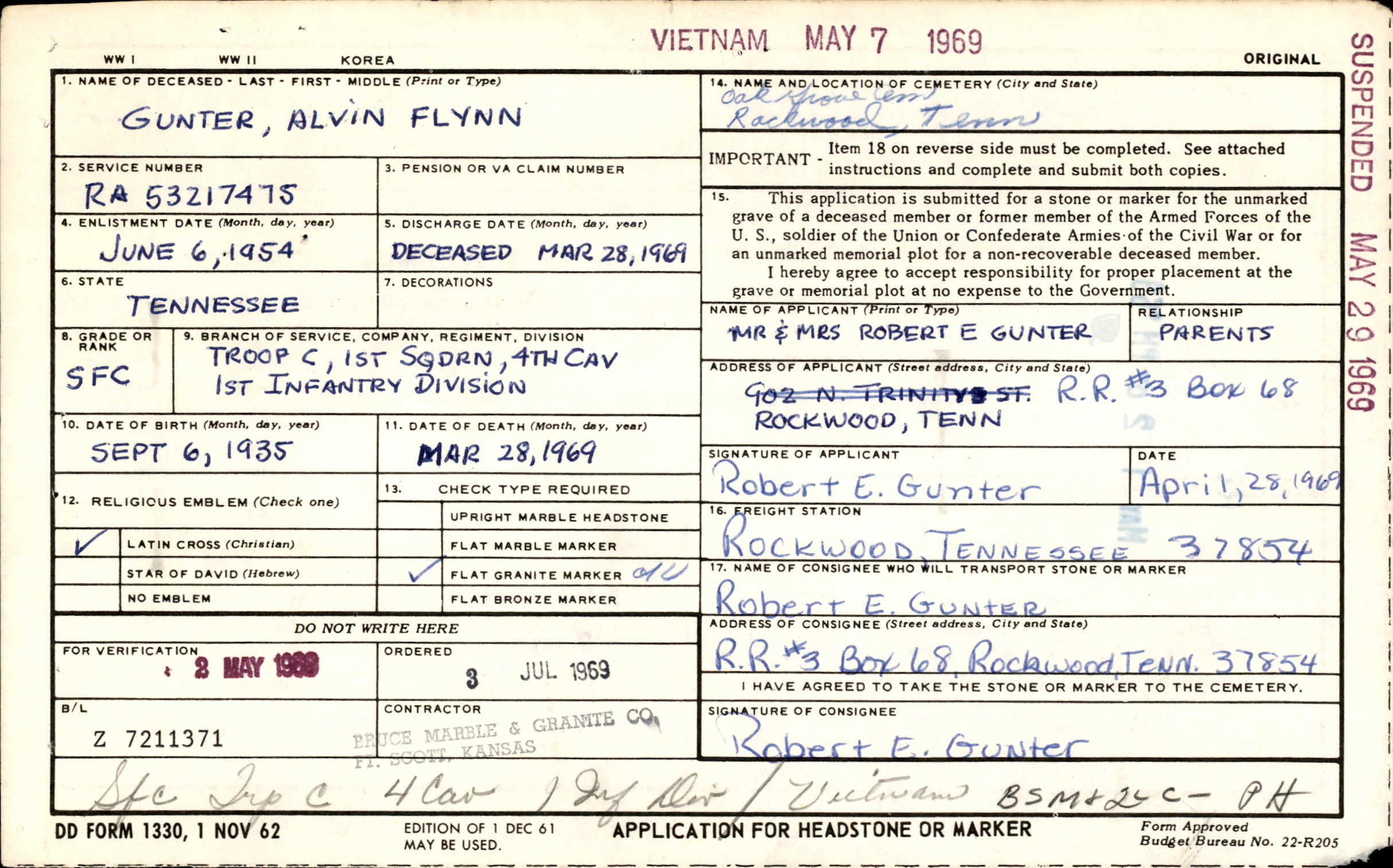 Sergeant First Class Alvin Flynn Gunter was born on September 5, 1935, and was originally from Rockwood, Tennessee. He served his country in the Vietnam War in the United States Army, as an infantryman in C Troop, 1st Squadron, 4th Cavalry, 1st Infantry Division. He was a 14 year veteran of the Army when his tour in viet began on February 28, 1969. One month later, on March 28, 1969, SFC Gunter was killed under hostile conditions in Binh Long province, South Vietnam; he was 33 years old at the time of his death. SFC Gunter is memorialized on the Vietnam Veterans Memorial on Panel 28W, Line 70.