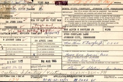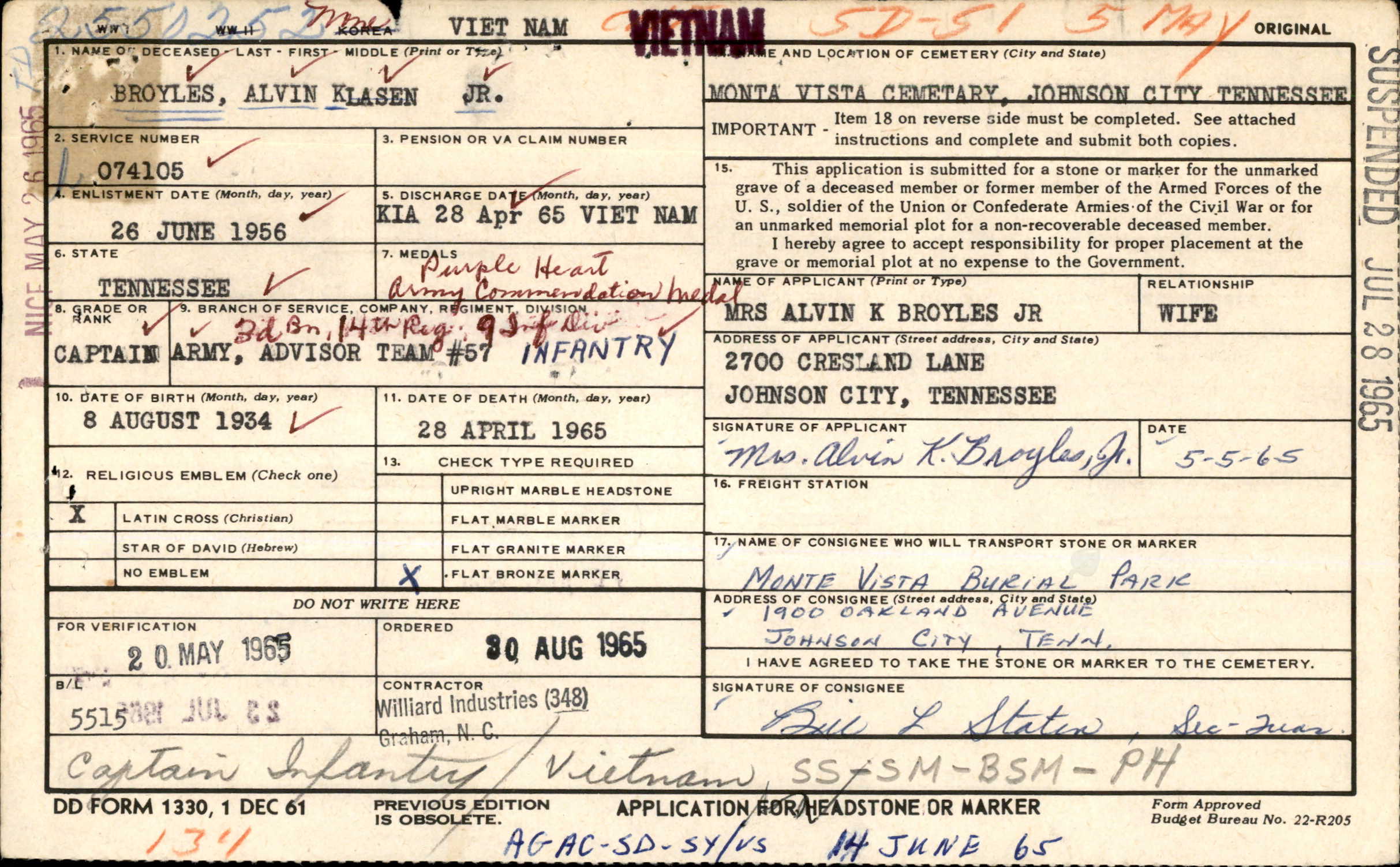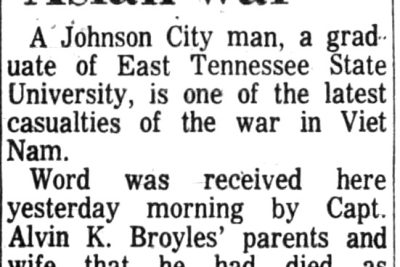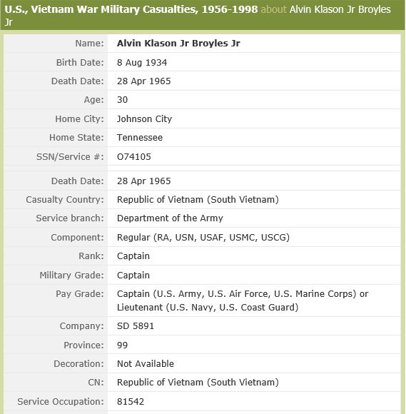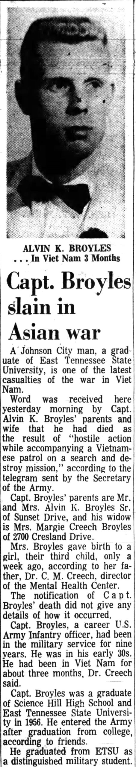 Alvin Klason Broyles Jr. was an ROTC graduate of East Tennessee State University. When he died in Vietnam, he held the rank of Captain in the Army.