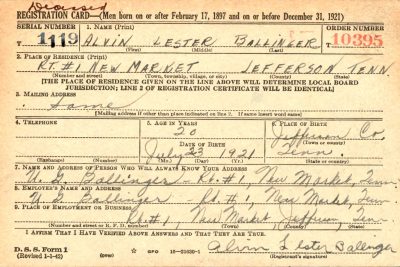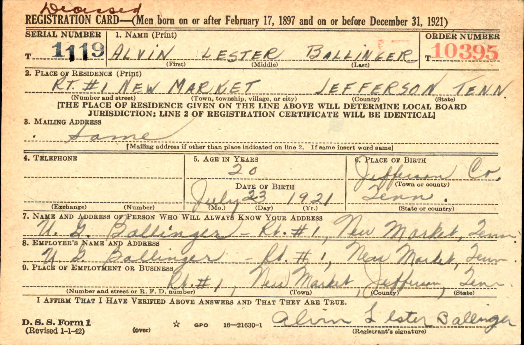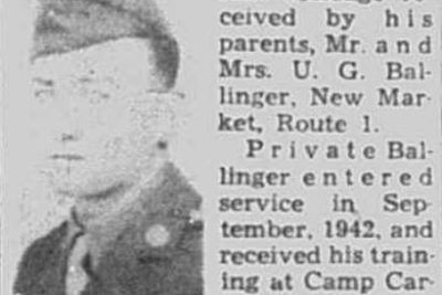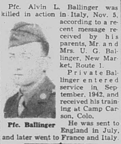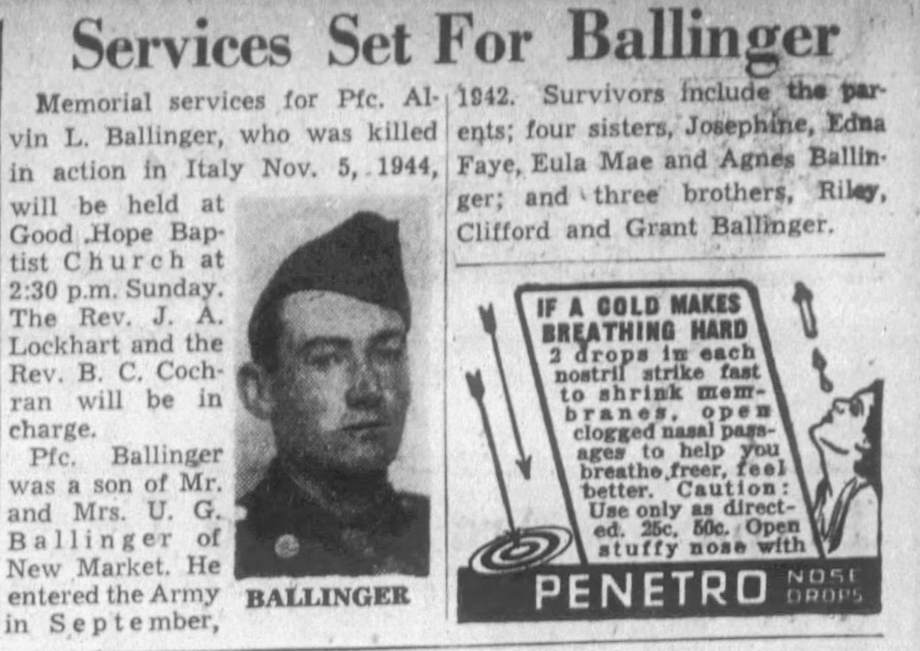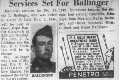 Memorial services for Pfc. Alvin L. Ballinger, who was killed in action in Italy Nov. 5, 1944, will be held at Good Hope Baptist Church. Pfc. Ballinger was a son of Mr. and Mrs. U.G. Ballinger of New Market. He entered the Army in September, 1942. Survivors include the parents; four sisters, Josephine, Edna Faye, Eula Mae and Agnes Ballinger; and three brothers, Riley, Clifford and Grant Ballinger.