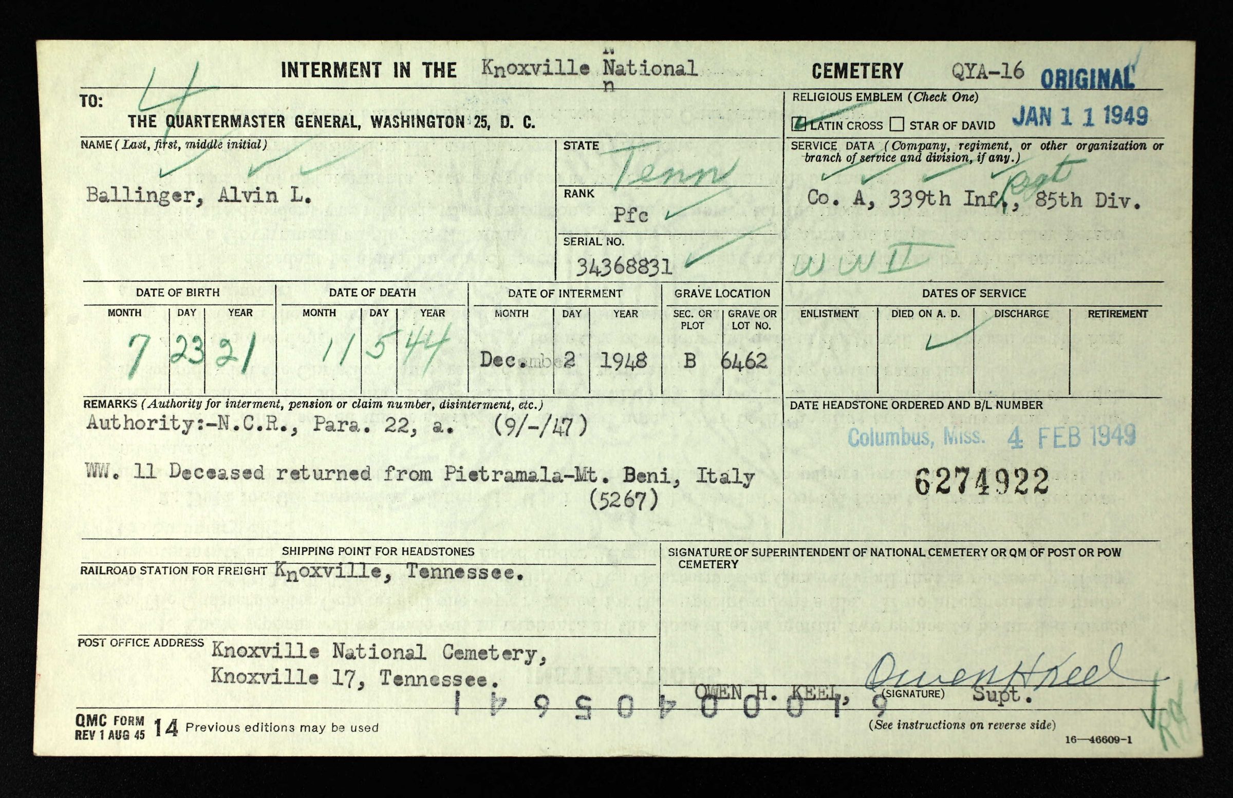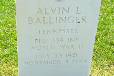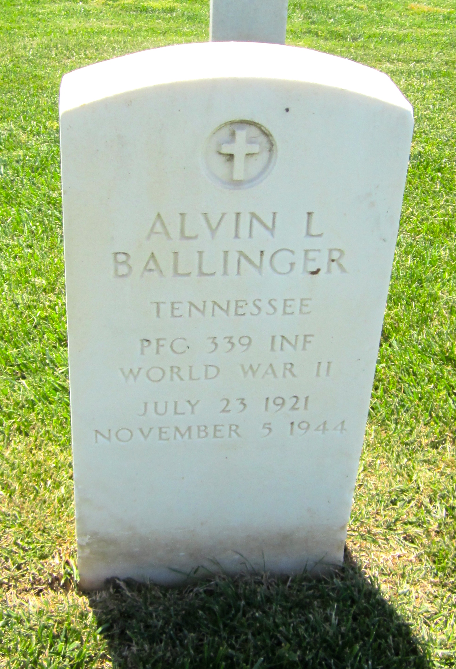 Pfc Ballinger was killed in action on 5 November 1944 in Italy. He was returned from Pietramala-Mt. Beni, Italy in 1948 and is buried at Knoxville National Cemetery.