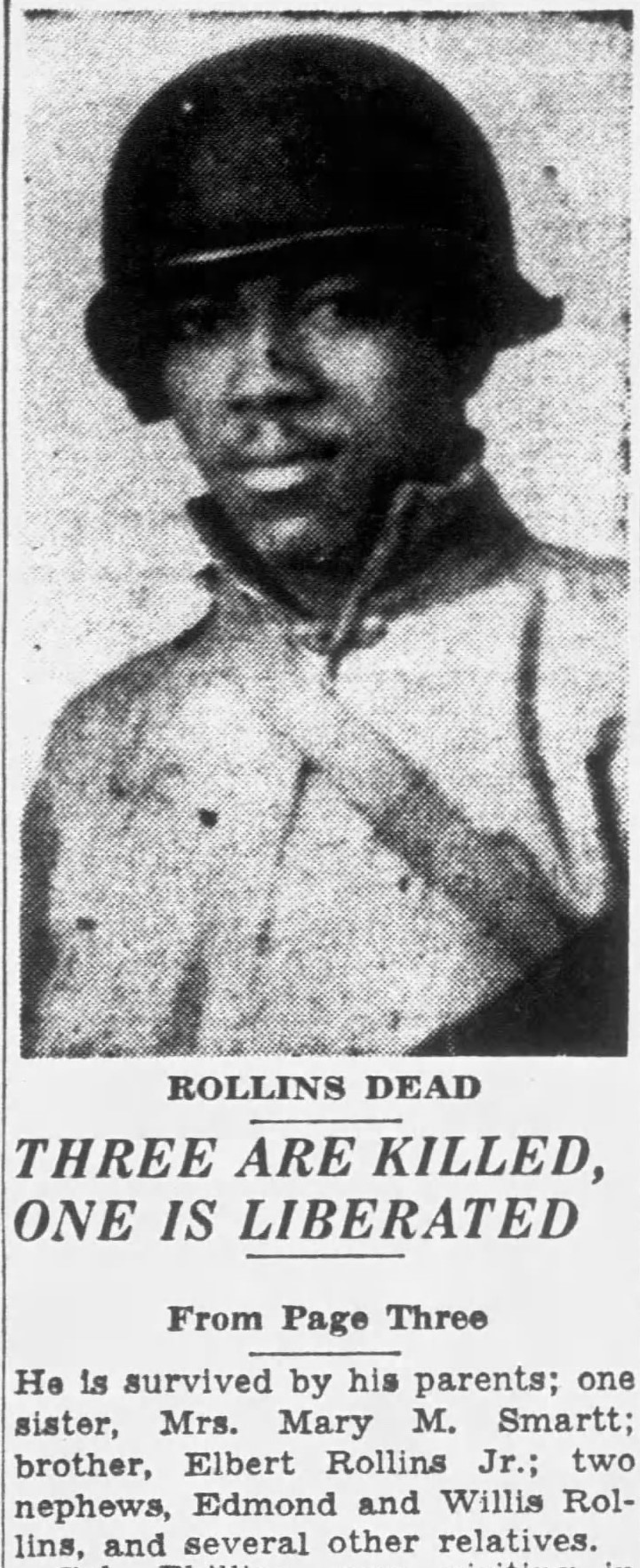 He is survived by his parents; one sister, Mrs. Mary M. Smartt; brother, Elbert Rollins Jr.; two nephews, Edmond and Willis Rollins, and several other relatives.