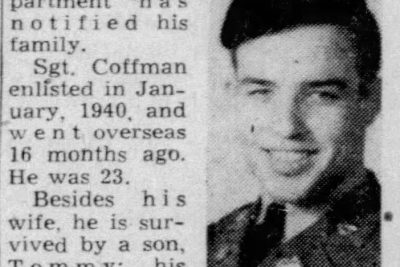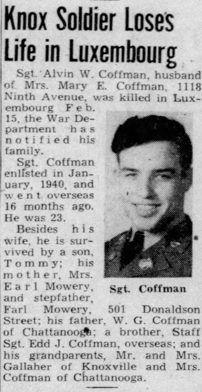 Besides his wife, he is survived by a son, Tommy; his mother, Mrs. Earl Mowery, and stepfather, Earl Mowery, 501 Donaldson Street; his father, W.G. Coffman of Chattanooga: a brother, Staff Sgt. Edd J. Coffman, overseas; and his grandparents, Mr. and Mrs. Gallaher of Knoxville and Mrs. Coffman of Chattanooga.