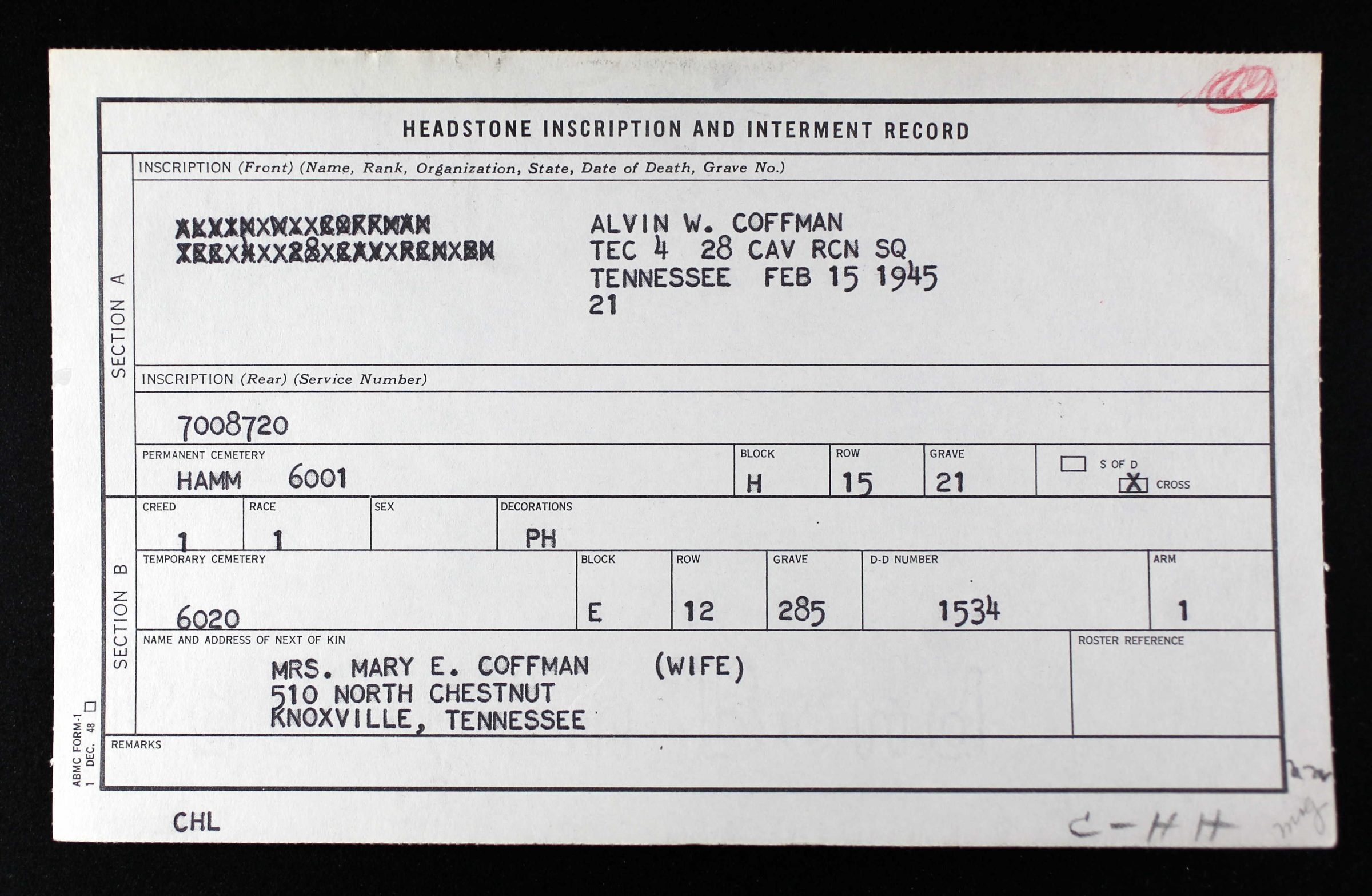 Tec4 Coffman was killed in action on the 15th of February 1945. He is interred at the Luxembourg American Cemetery, Luxembourg, plot H, row 15, grave 21.