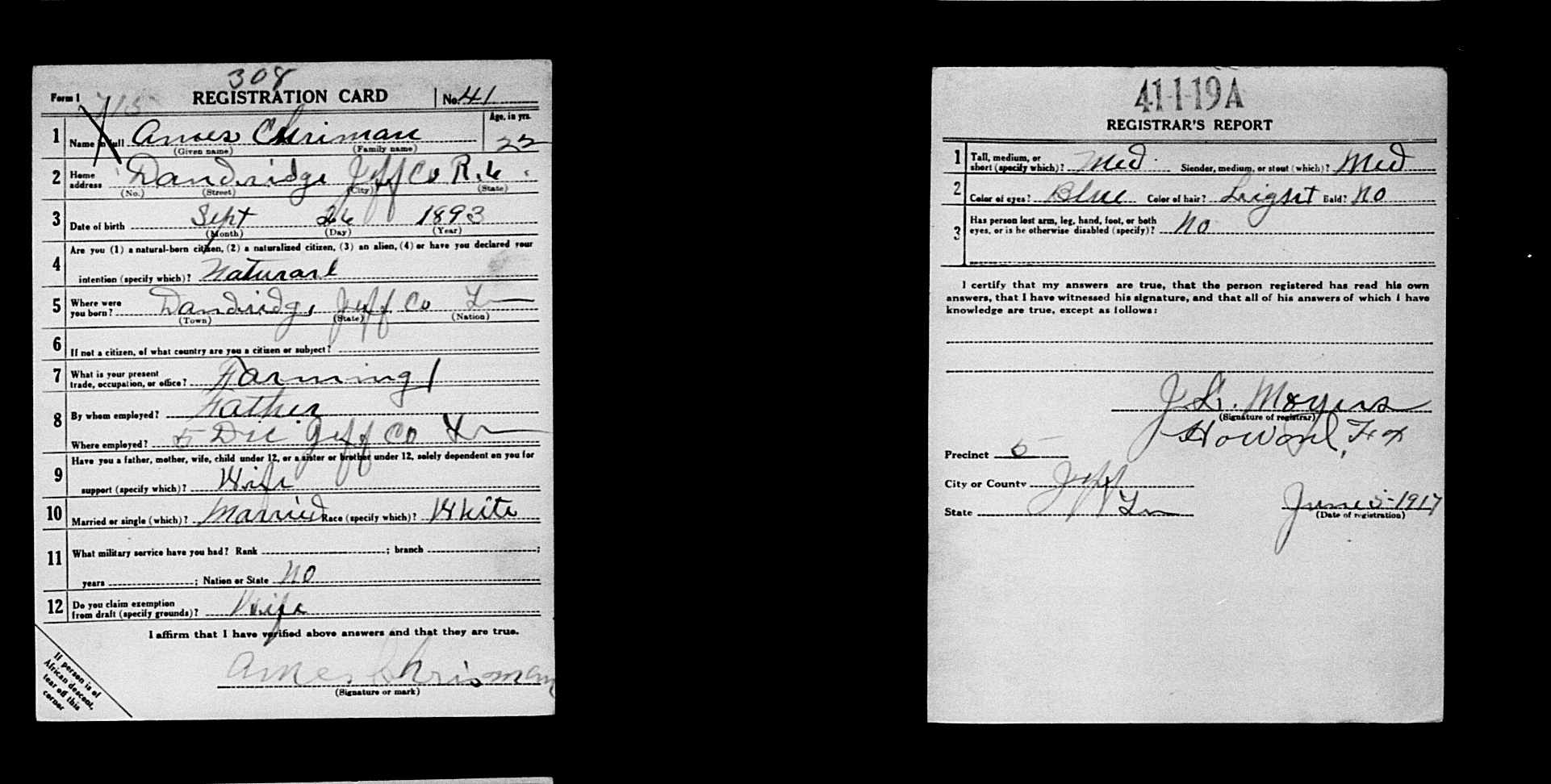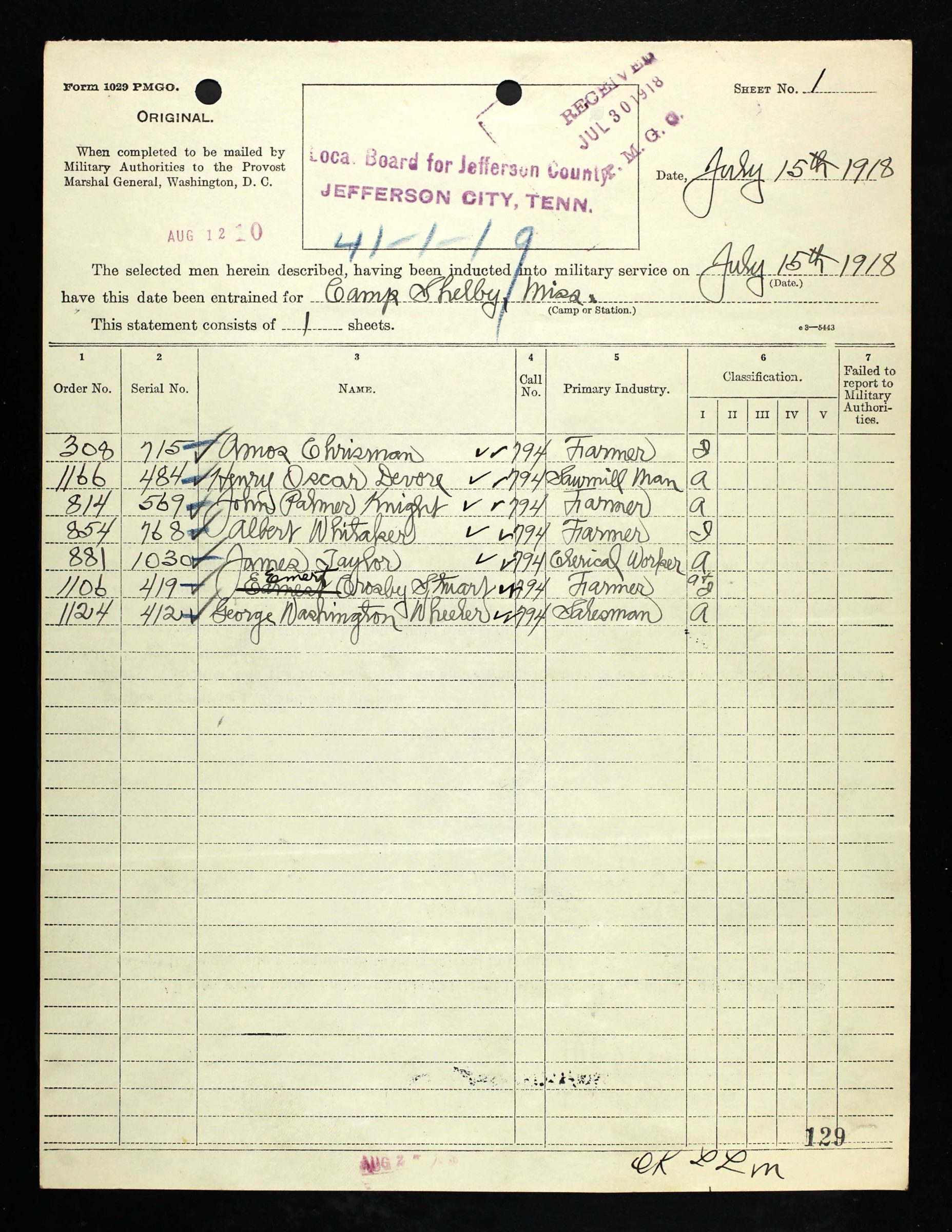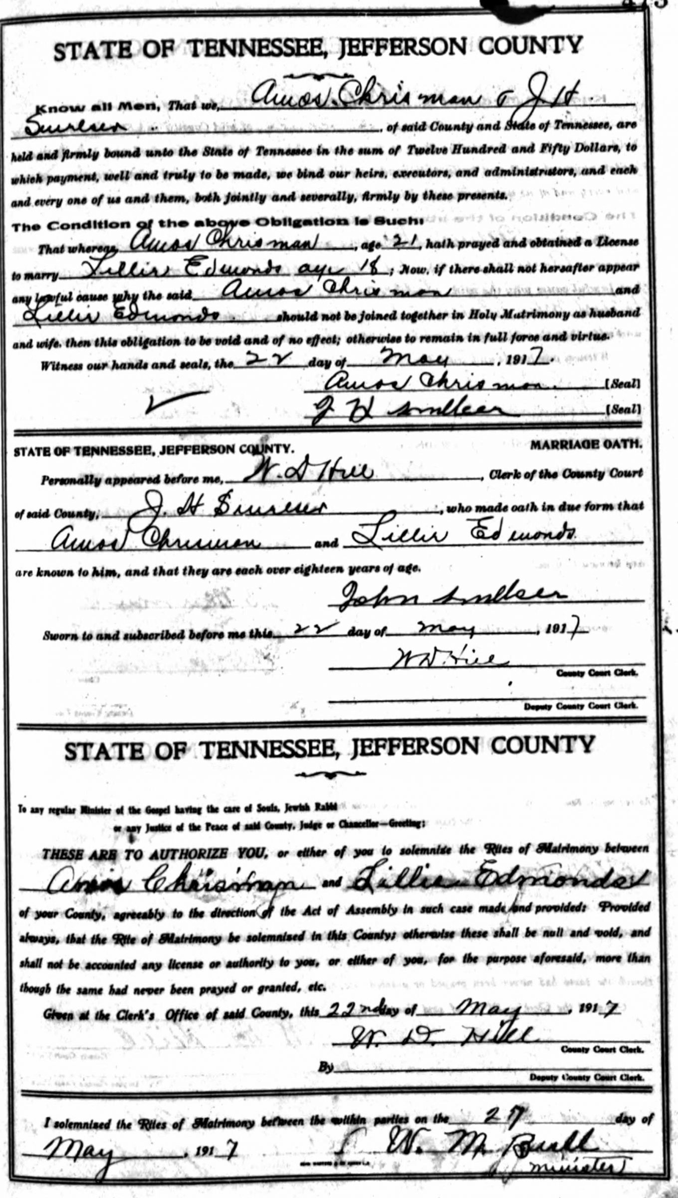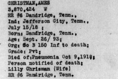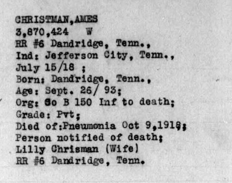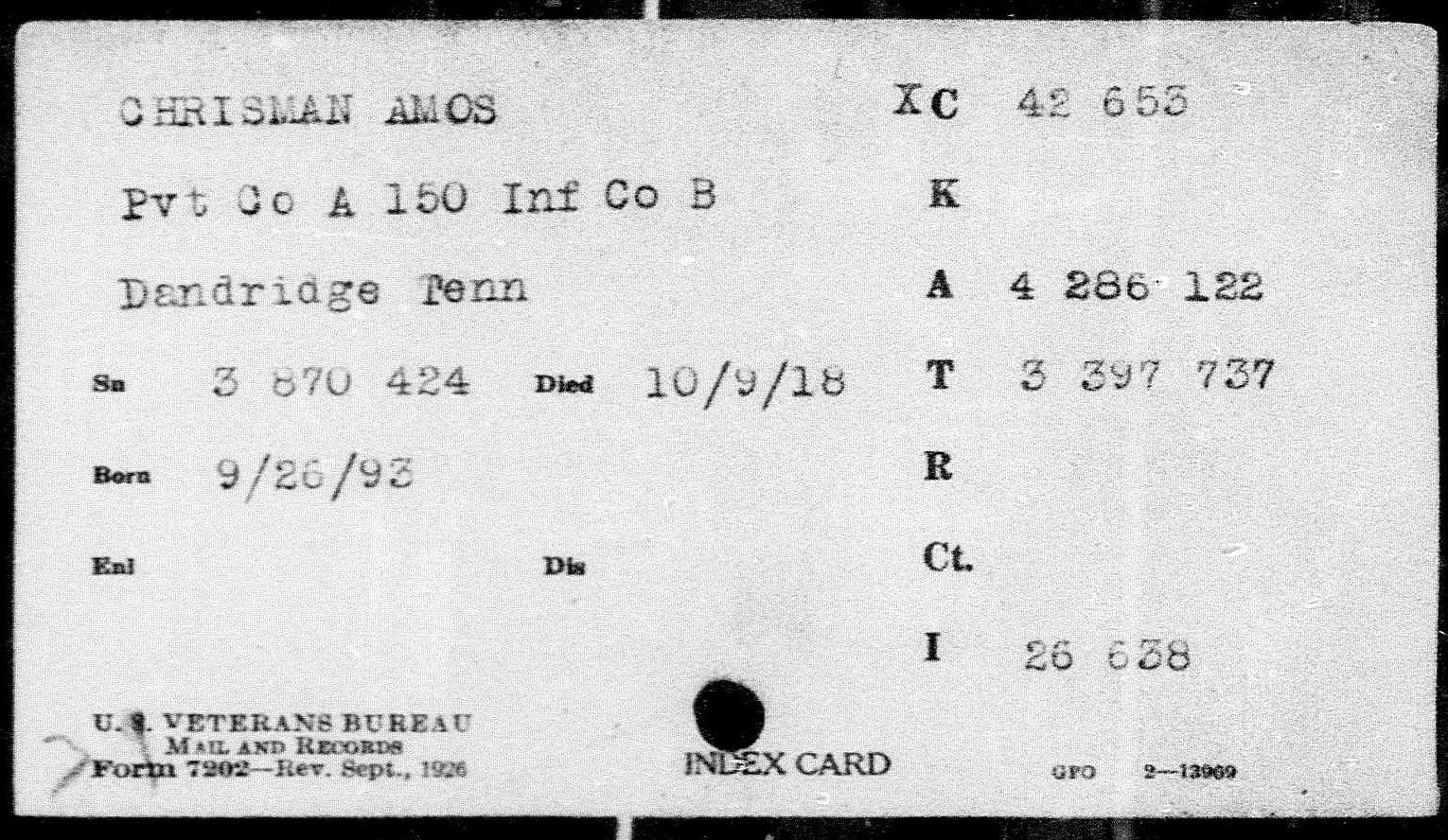 Amos Chrisman, also listed as Ames Christman in State records, was born in 1898 in Dandridge, Tennessee. He was a farmer before his induction into military service on 15 July 1918 at Camp Shelby, Mississippi. He died in 1918 of pneumonia.