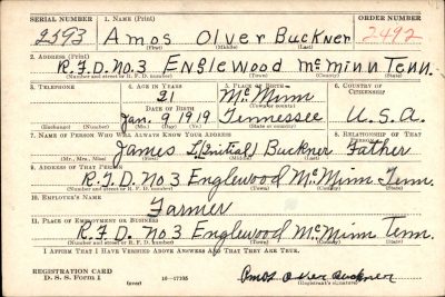 Amos Oliver Buckner was born on 20 January 1920 to James William “Will” Buckner and Nannie J. Buckner.
