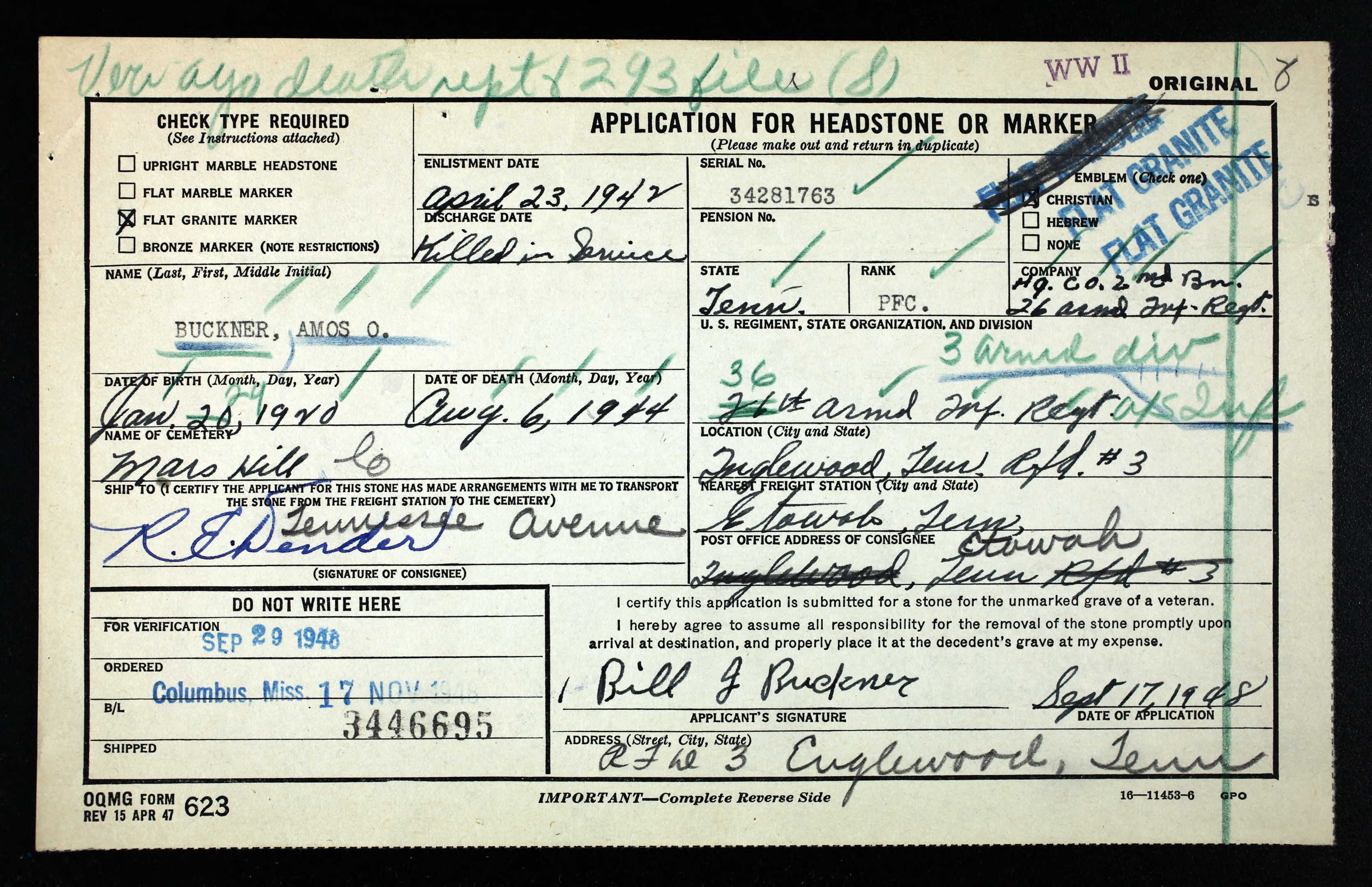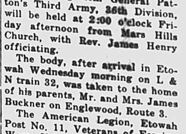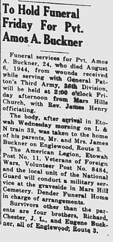 Funeral services for Pvt. Amos A. Buckner, 24, who died August 6, 1944 from wounds received while serving with General Patton’s Third Army,. 36th Division, will be held at 2:00 o’clock Friday afternoon from Mars Hills Church. The body , after arrival in Etowah Wednesday morning on L&N train 32, was taken to the home of his parents, Mr. and Mrs. James Buckner of Englewood, Route 3. Survivors other than the parents are four brothers, Richard, Chester, J.L., and Eugene Bucker, all of Englewood, Route 3.