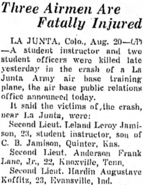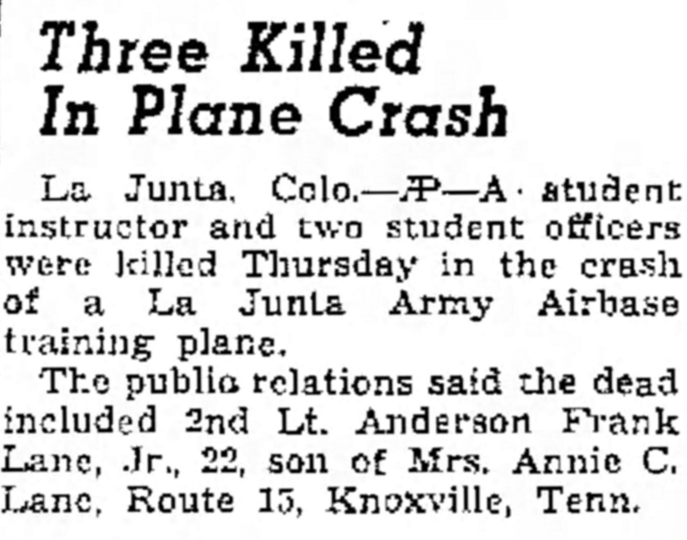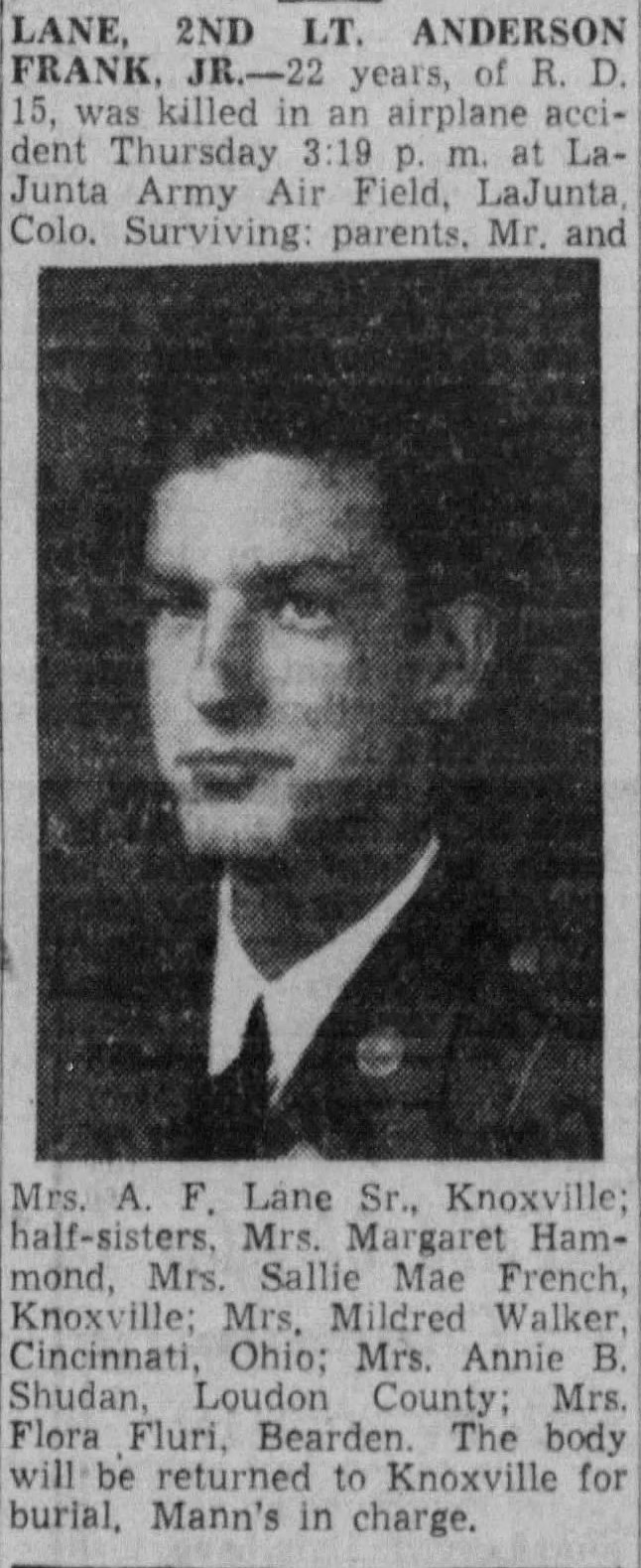 2nd Lt. Anderson Frank Lane Jr., 22 years, of R.D. 15, was killed in an airplane accident Thursday 3:19 p.m. at LaJunta Army Air Field, LaJunta, Colorado. Surviving; parents, Mr. and Mrs. A.F. Lane Sr., Knoxville; half-sisters, Mrs. Margaret Hammond, Mrs. Sallie Mae French, Knoxville; Mrs. Mildred Walker, Cincinnatti, Ohio; Mrs. Annie B. Shudan, Loudong County; Mrs Flora Fluri, Bearden.
