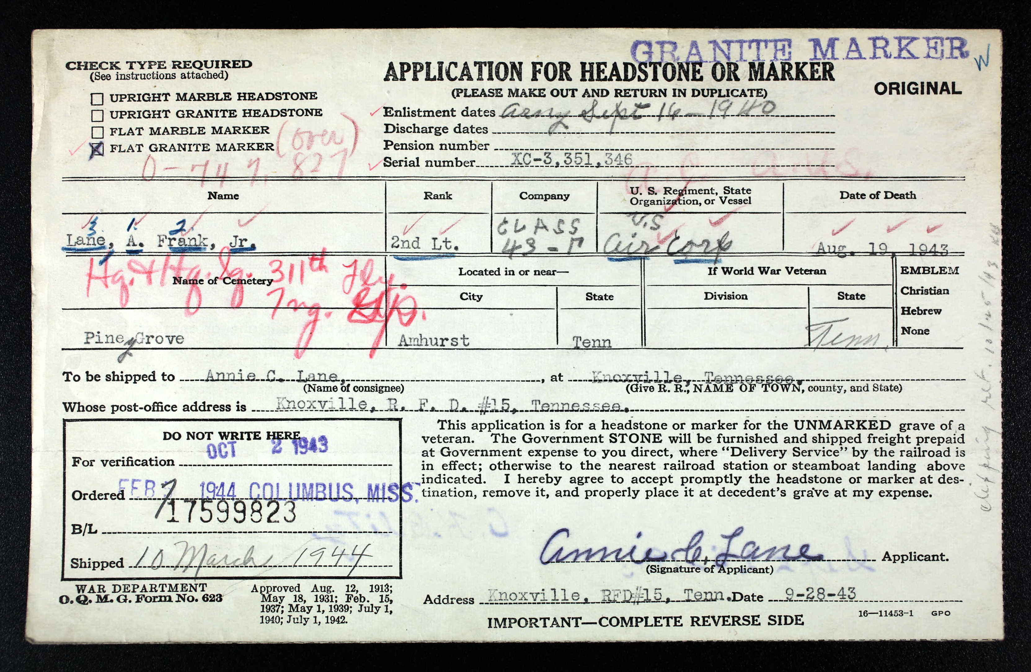 Anderson Frank Lane Jr. was the son of Anderson Franklin Lane and Annie Cora Johnson. He died non Battle while serving in the Air Corps. His halb sibling Pvt. Edward Walden Lane died at sea during World War I.
