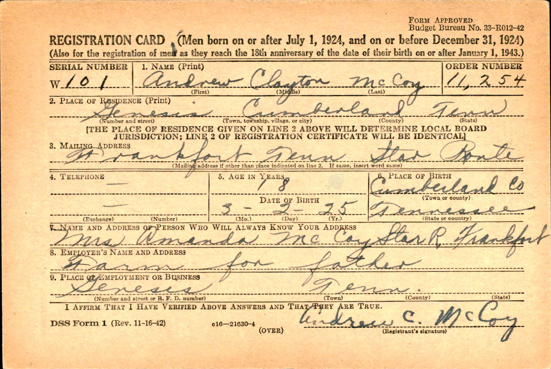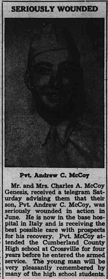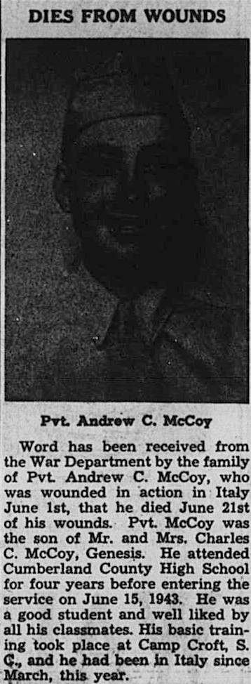 Word has been received from the War Department by the family of Pvt. Andrew C. McCoy, who was wounded in action in Italy June 1st, that he died June 21st of his wounds. Pvt. McCoy was the son of Mr. and Mrs. Charles C. McCoy, Genesis. He attended Cumberland County High School for four years before entering the service on June 15, 1943. He was a good student and well like by all his classmates. His basic training took place at Camp Croft, S.C. and he had been in Italy since March, this year.