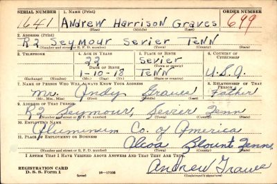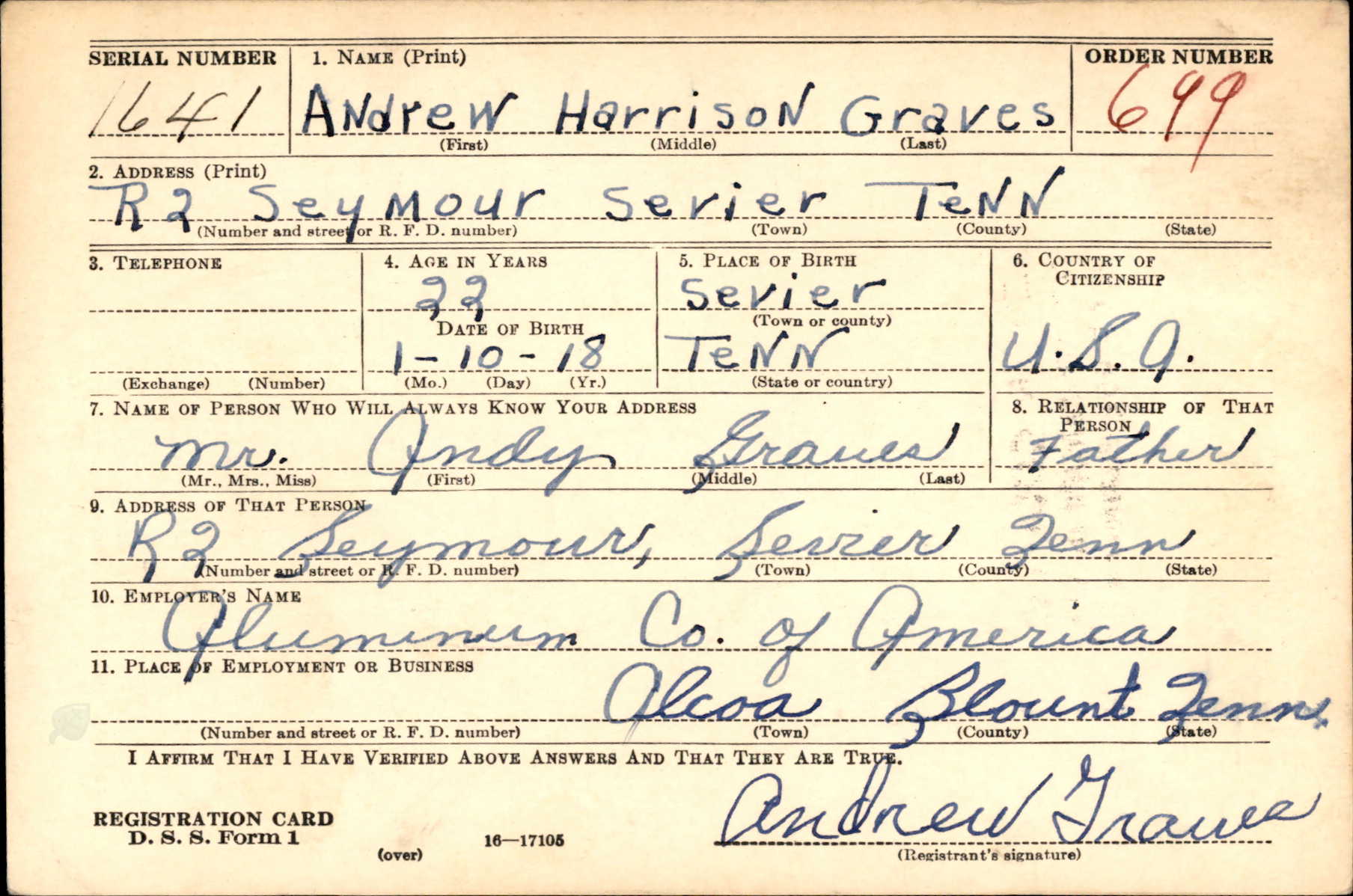 Andrew Harrison Graves was born 10 January 1918 in Seymour, Tennessee, the son of Andrew Jackson “Andy” Graves and Lola Mae Rogers. He was married to Juanita Audley Ballard and father of Barbara Andrew Graves.