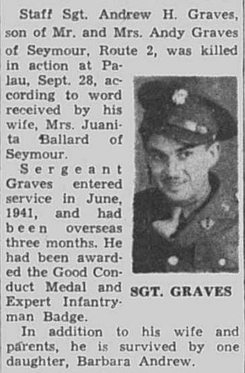 Staff Sgt. Andrew H. Graves, son of Mr. and Mrs. Andy Graves of Seymour, Route2, was killed in action at Palau, Sept. 28, according to word received by his wife, Mrs. Juanita Ballard of Seymour.