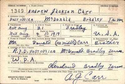 Andrew Jackson Carr was the son of Samuel Lewis Carr and Clemmie Loftis. He enlisted on 7 June 1941 at Fort Oglethorpe in Georgia. He was killed in action in France.