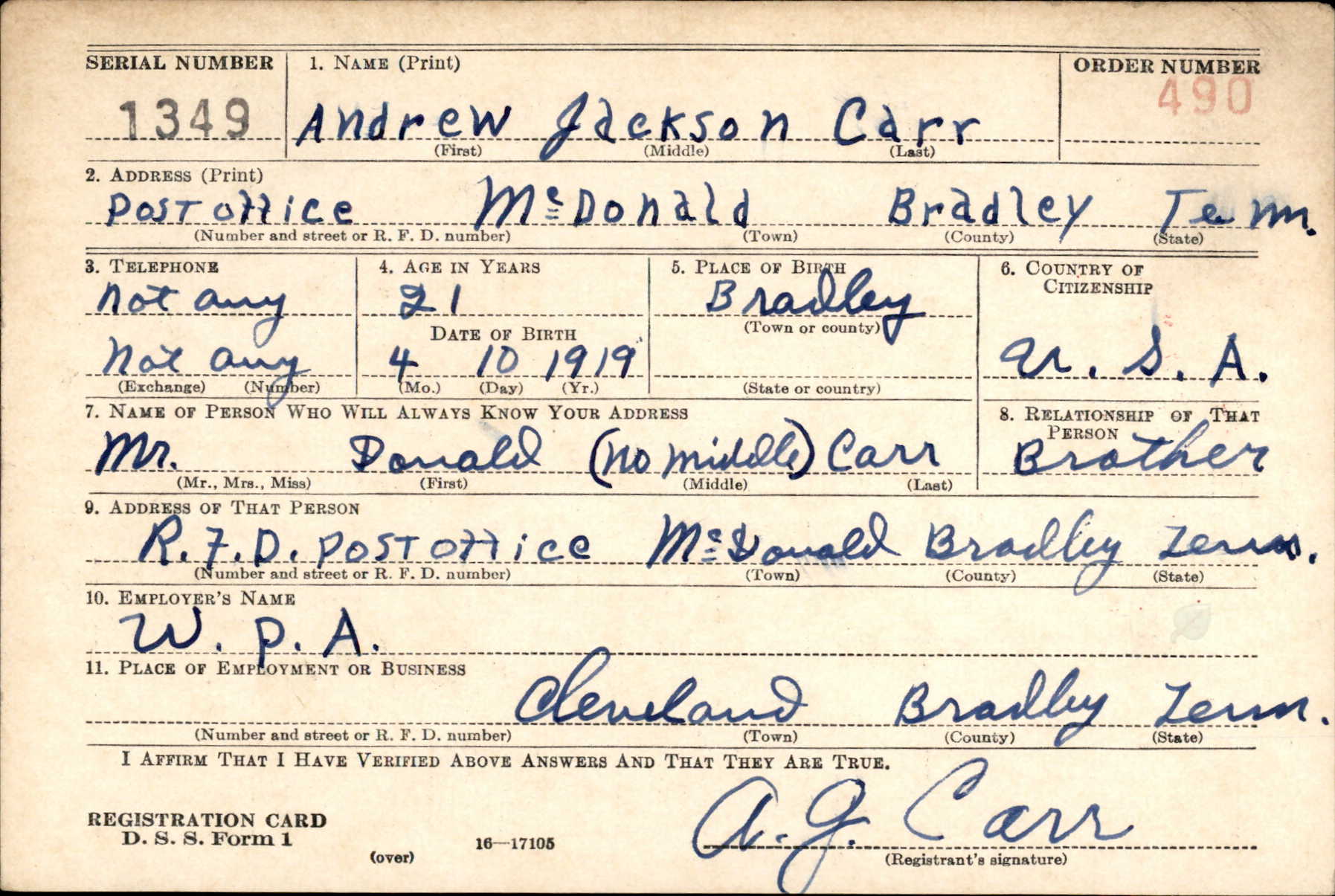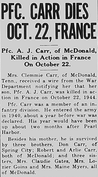 Mrs. Clemmie Carr, of McDonald, Tenn., received a wire from the War Department notifying her that her son, Pfc. A.J. Carr was killed in action on October 22, 1944. Pfc. Carr was a member of an infantry division. He entered the army in 1940, about a year before war was declared. His year would have been up about two months after Pearl Harbor. Besides his mother, he is survived by three brothers, Don Carr of Spring City; Robert and Arlie Carr, both of McDonald; and three sisters, Mrs. Claudie Gates, Mrs. Lozier Goins and Mrs. Maine Myers, all of McDonald.