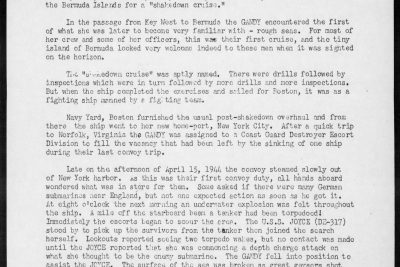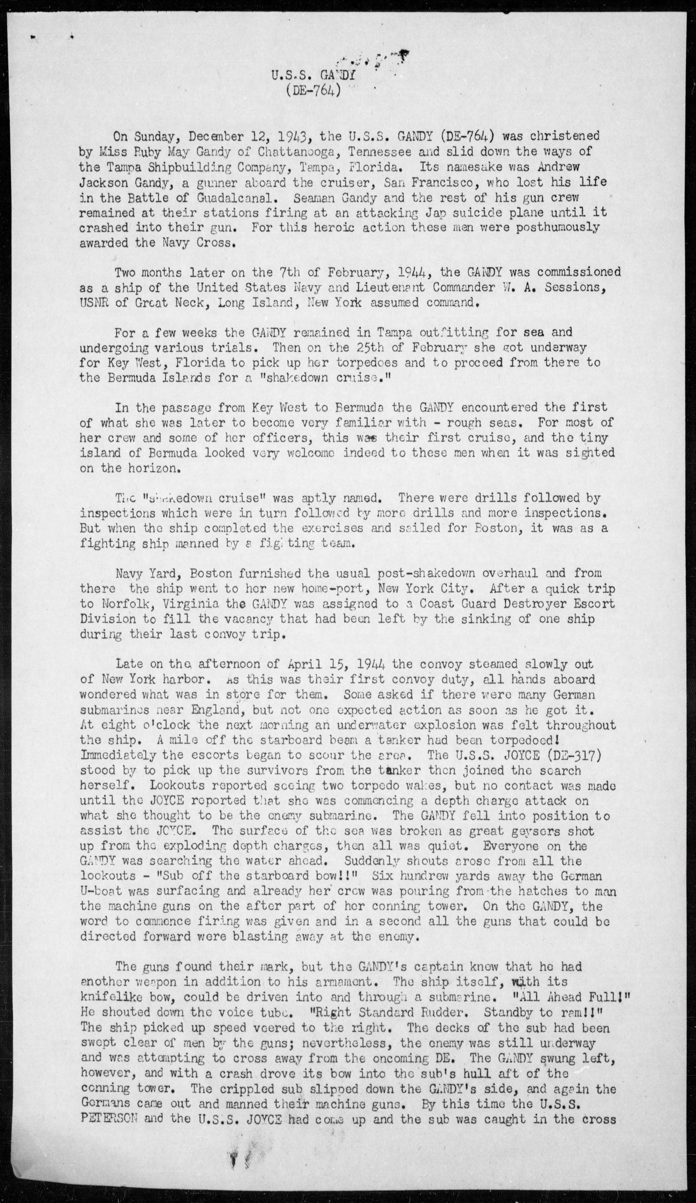 On Sunday, December 12, 1943, the U.S.S. Gandy (DE-764) was christened by Miss Ruby Mae Gandy of Chattanooga, Tennessee and slid down the ways of the Tampa Shipbuilding Company, Tampa, Florida. Its namesake was Andrew Jackson Gandy, a gunner aboard the cruiser, San Francisco, who lost his life in the battle of Guadalcanal. Seaman Gandy and the rest of his gun crw remained at their stations firing at an attacking Jap suicide plane until it crashed into their gun. For this heroic action these men were posthumously awarded the Navy Cross.