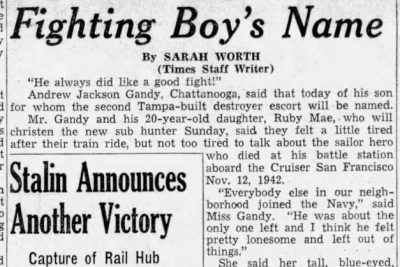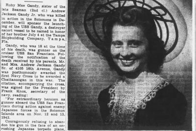 The official communication from Rear Admiral Randall Jacobs, of the navy department, sent to Mr. and Mrs. Gandy apprising them of the death of their son on Dec. 2, read as follows: “The navy department regrets to inform you that your son, A.J. Gandy Jr., seaman second class, was killed in action in the Pacific.” The 17-year-old boy attended East Lake Junior High School. He is survive by two brothers, Robert and Roscoe, and three sisters, Ruby, Gladys and Mabel Lee Gandy.
