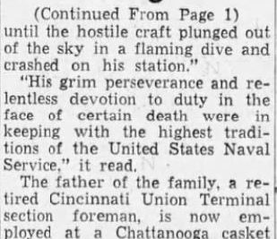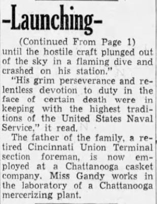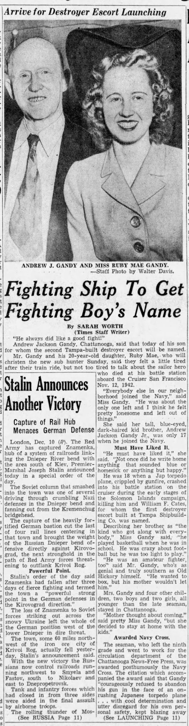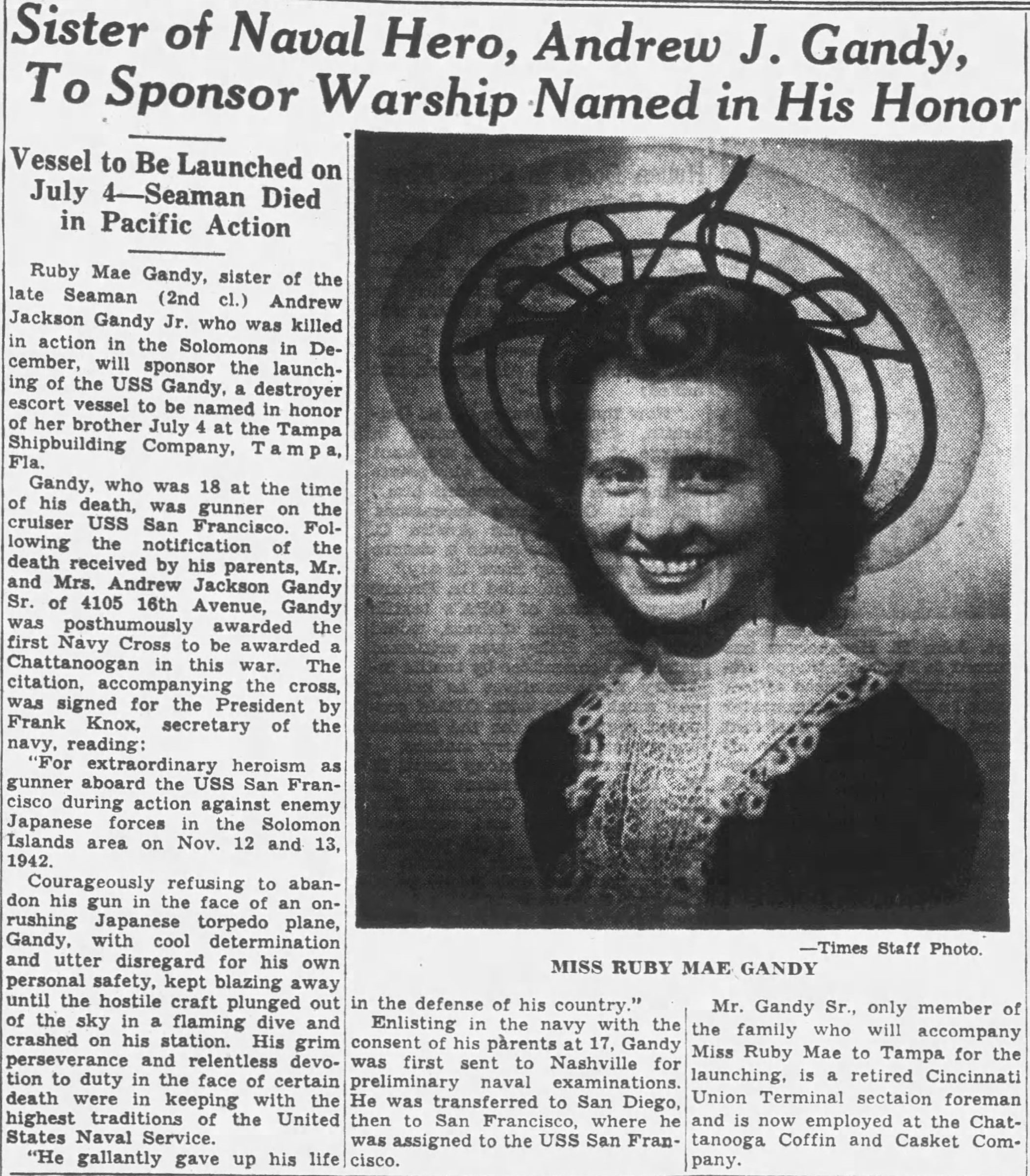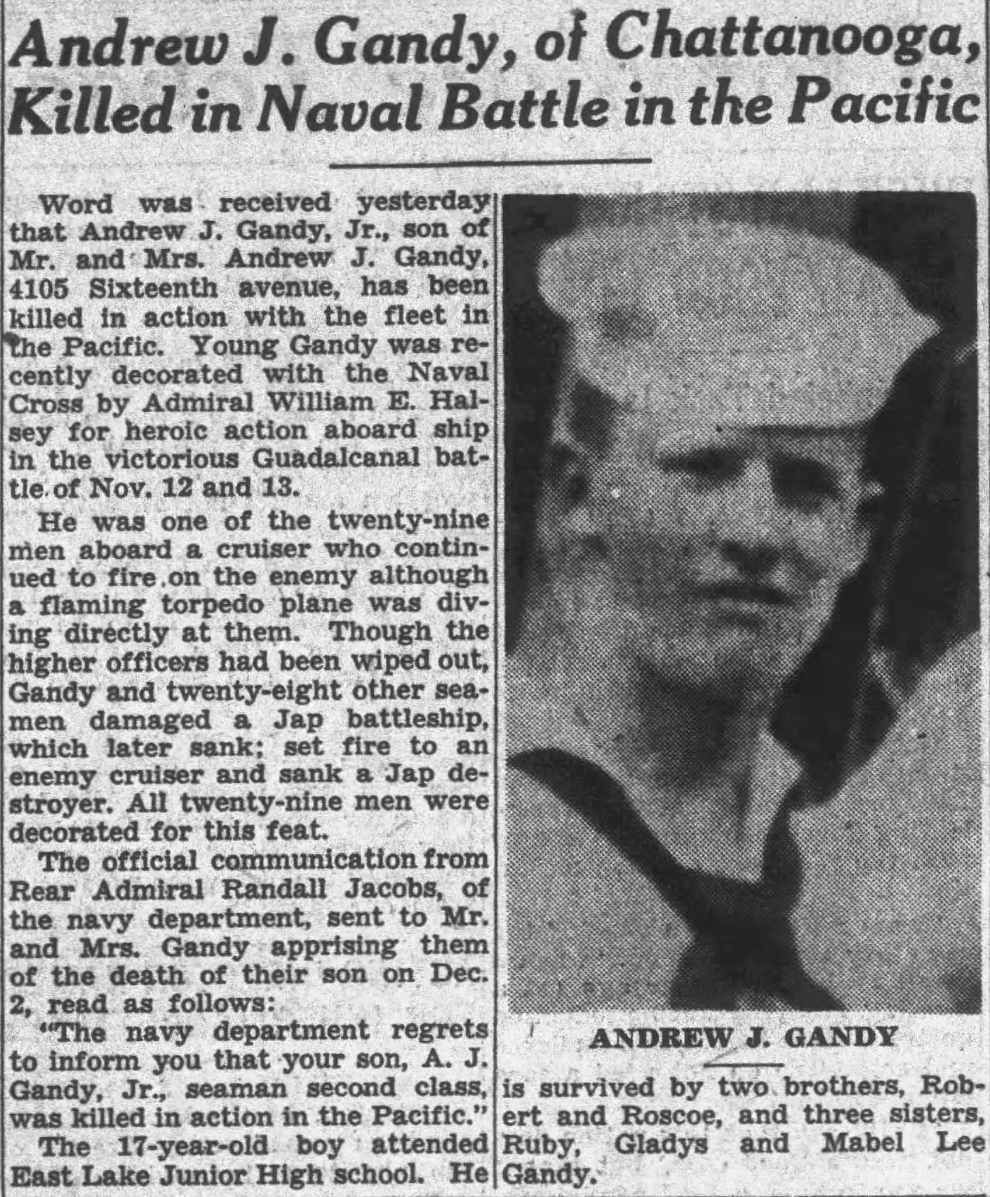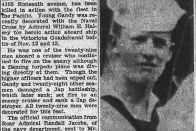 Word was received yesterday that Andrew J. Gandy Jr., son of Mr. and Mrs. Andrew J. Gandy, 4105 Sixteenth avenue, has been killed in action with the fleet in the Pacific. Young Gandy was recently decorated with the Naval Cross by Admiral William E. Halsey for heroi action aboard ship in the victorious Guadalcanal battle of Nov. 12 and 13. He was one of the twenty-nine men aboard a cruiser who continued to fire on the enemy although a flaming torpedo plane was diving directly at them. Though the highter officers had been wiped out, Gandy and twenty-eight other seamen damaged a Jap battleship, which later sank; set fire to an enemy cruiser and sank a Jap destroyer. All twenty-nine men were decorated for this feat.