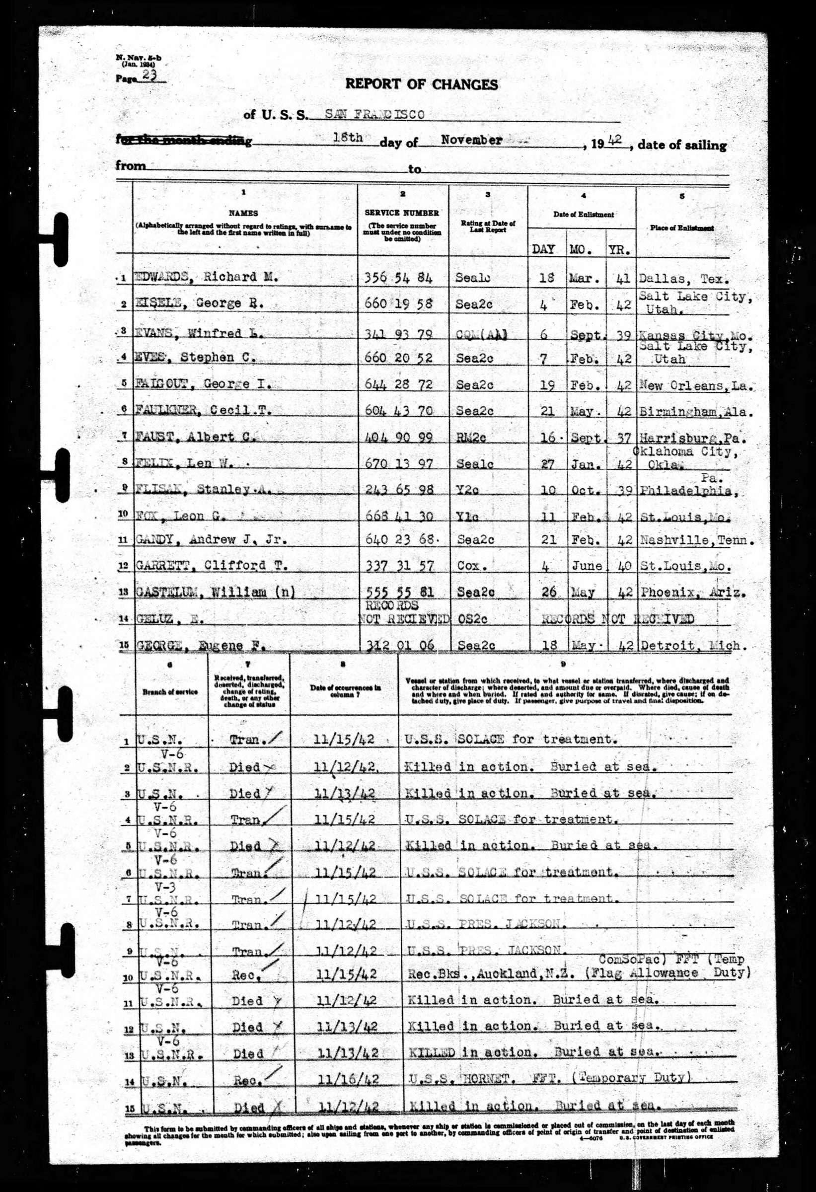 For his actions on November 12, 1942 aboard the USS San Francisco he was awarded the Navy Cross: