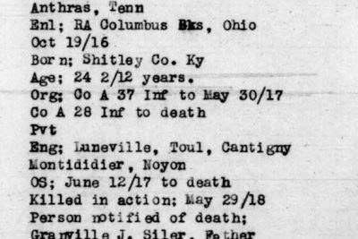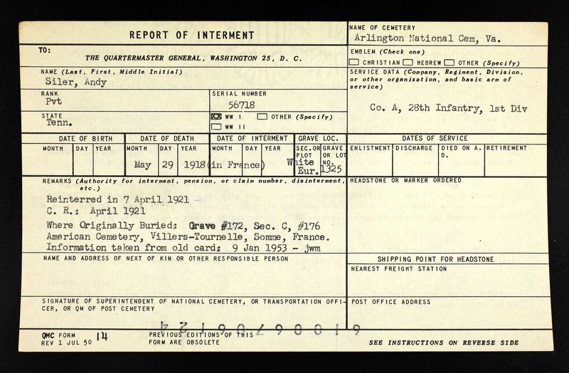 He was killed in action on 29 May 1918 in France. He was initially buried at the American Cemetery, Villers-Tournelle, Somme, France. He is buried at Arlington National Cemetery, VA, White, Eur., 1325.