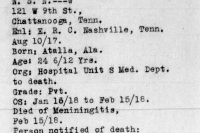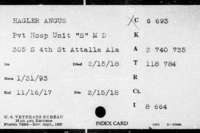 Angus Hagler was born in Atalla, Alabama on 31 January 1893, son of W.J. Hagler. He died of meningitis on 15 February 1918 in Le Havre, France.
