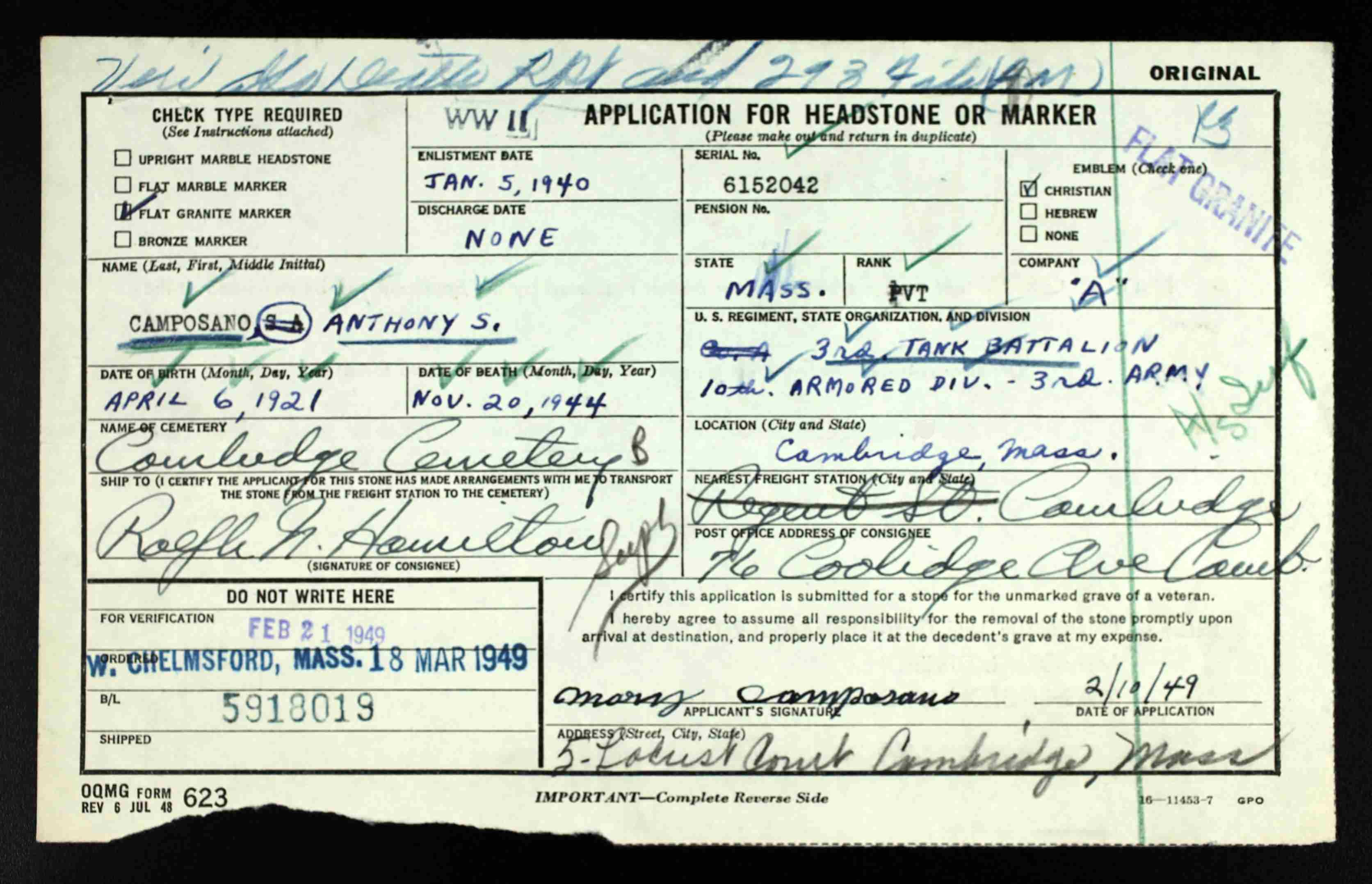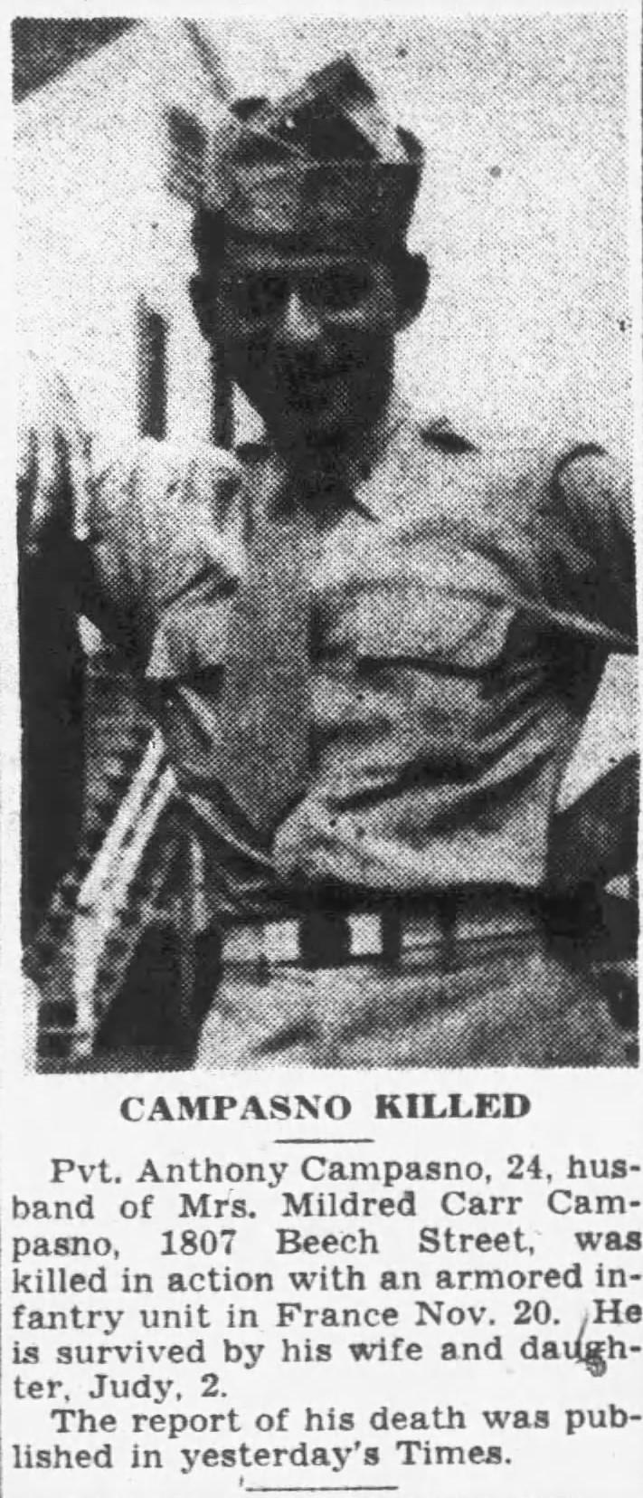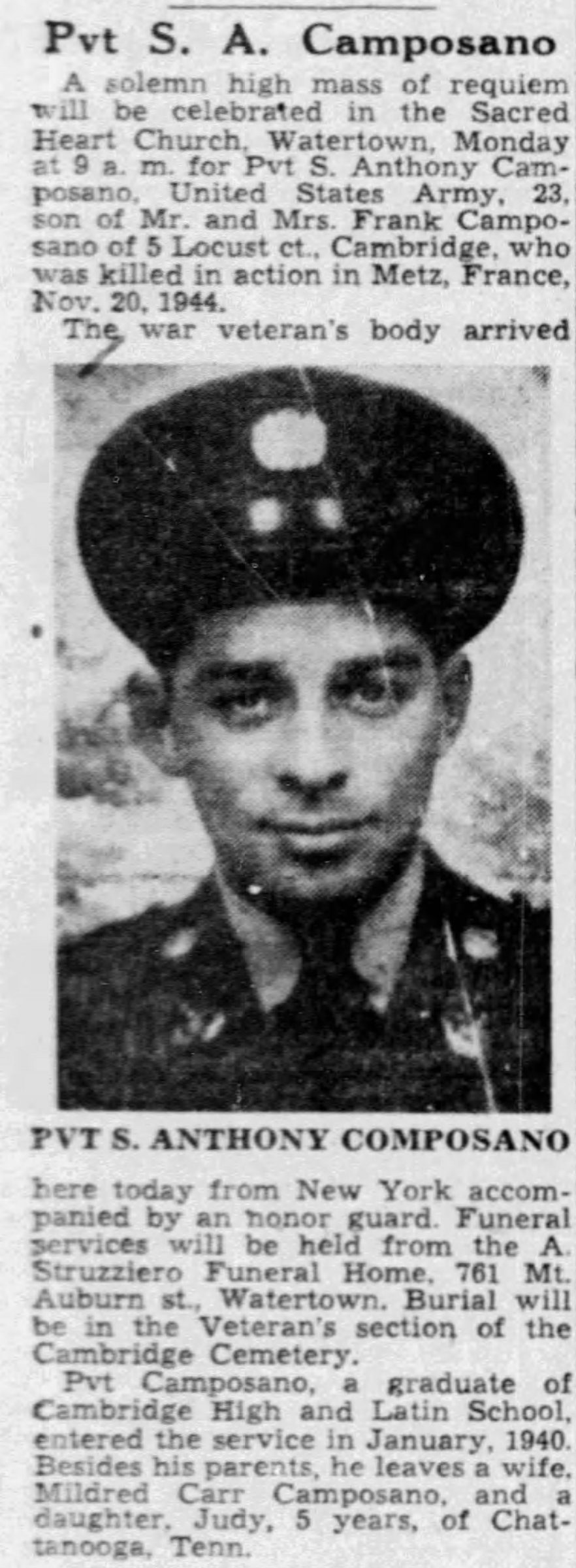 A solemn high mass of requiem wil be celebrated in the Sacred Heart Church, Watertown for Pvt. S. Anthony Camposano, United States Army, 23, son of Mr. and Mrs. Frank Camposano of 5 Locust st., Cambridge, who was killed in action in Metz, France, Nov. 20, 194. The war veteran’s body arrived here from New York accompanied by an honor guard.Burial will be in the Veteran’s section of the Cambridge Cemetery.