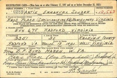 Antie Emmanuel Souder was born on 13 March 1921, at Raleigh, West Virginia, the son of Jahu Franklin Souder and Dossie Missouri Foley.