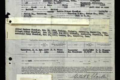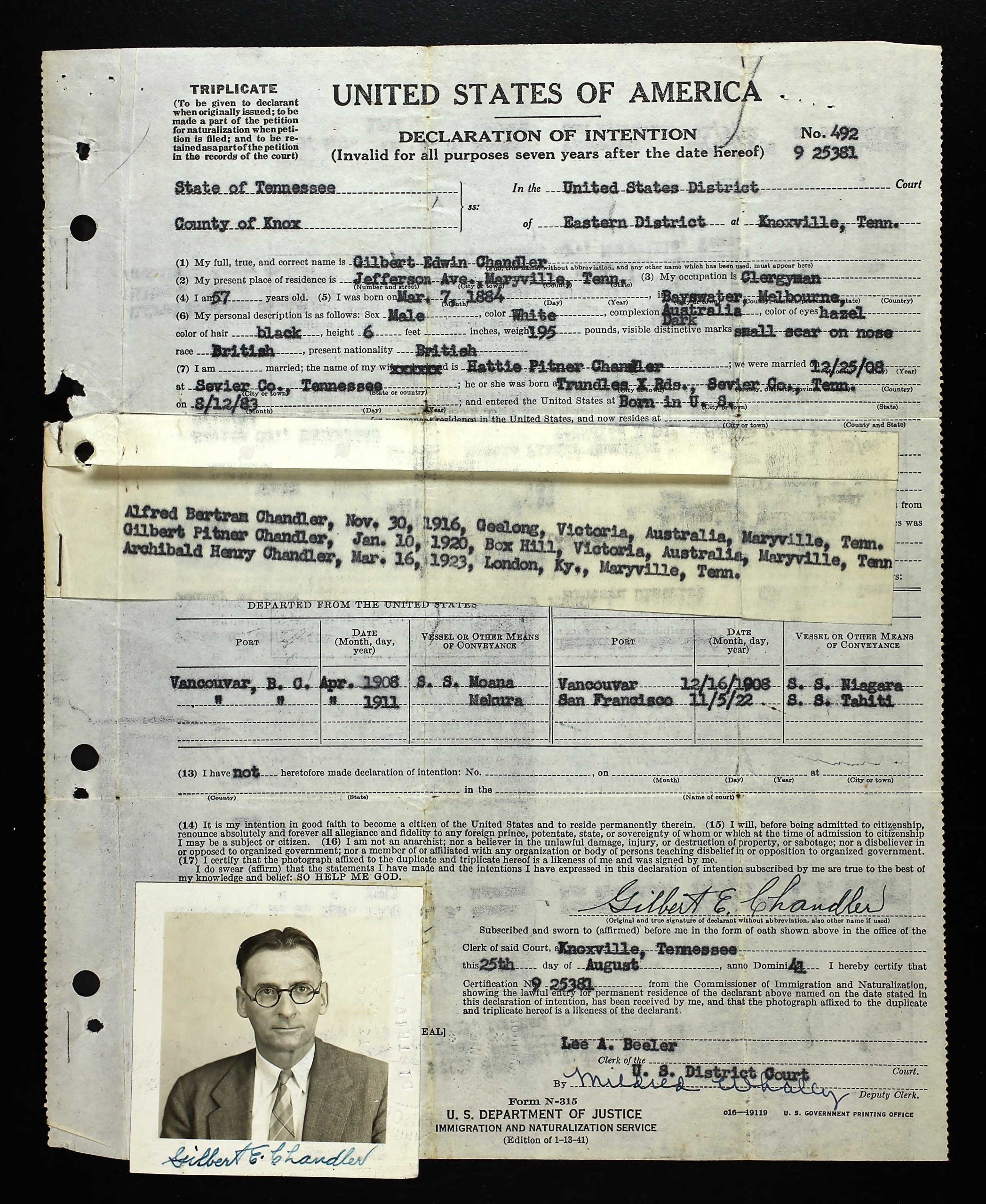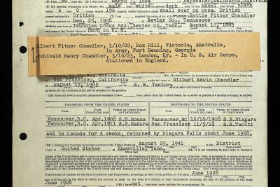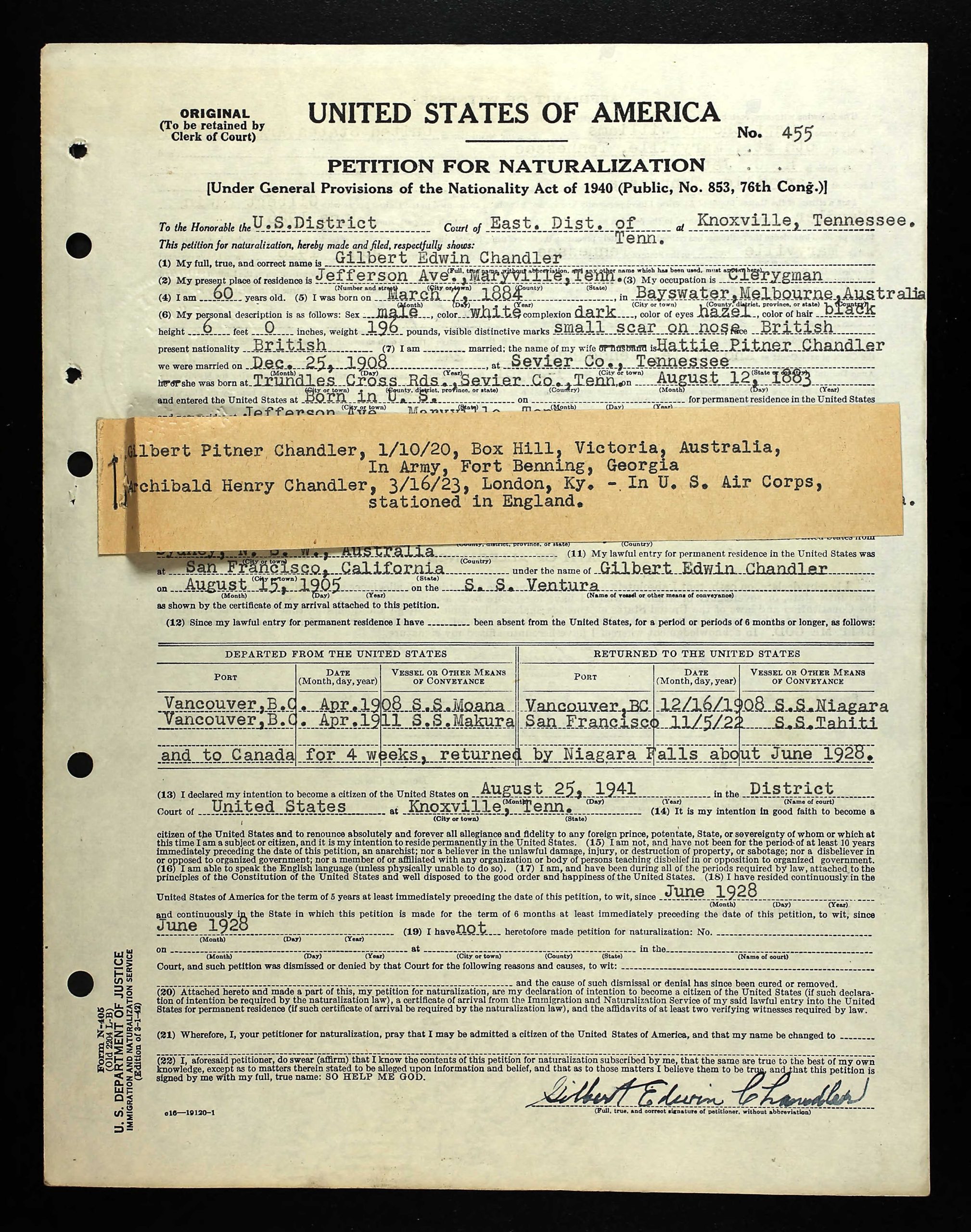 Archabald Henry “Harry” Chandler was born on 16 March 1923 to Gilbert Edwin Chandler and Hattie Ethel Pitner. His father the Rev. Gilbert Chandler was born in Australia and emigrated to the United States in 1905. He owned a floral shop in Knoxville where Archibald was employed before going to the Army Air Forces